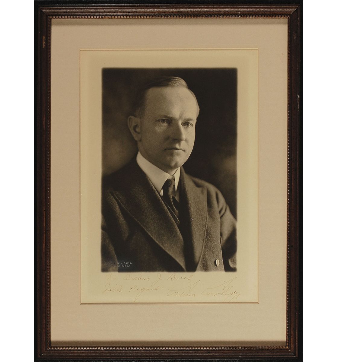 Vintage matte-finish 8 x 11.25 Harris and Ewing bust portrait, signed and inscribed in the lower border in fountain pen, “To Arthur J. Burch, With regards, Calvin Coolidge.” Matted and framed to an overall size of 12 x 16. In fine condition, with some light silvering around photographer’s stamp.