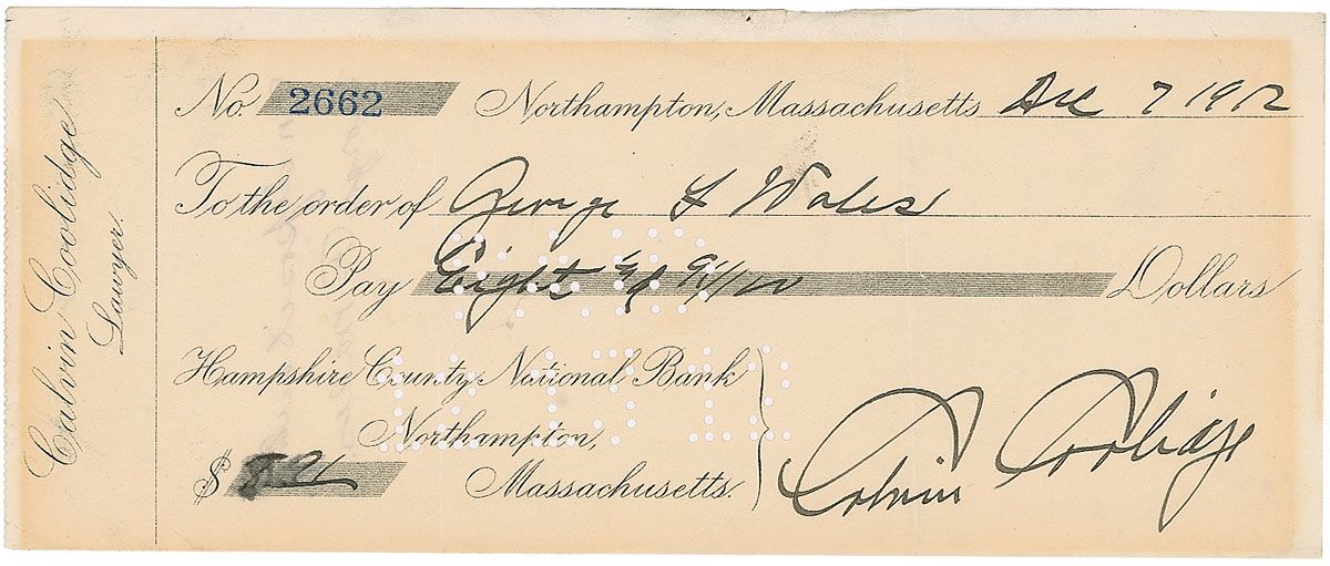Business check, 8.25 x 3.5, filled out and signed by Coolidge, payable to George F. Wales for $8.91, December 7, 1912. Two vertical folds, one through a single letter of signature, uniform toning from previous display, and light show-through from endorsement on reverse, otherwise fine condition.