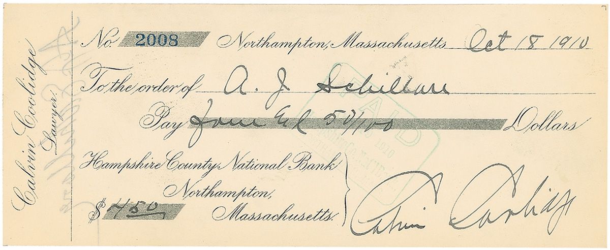 Business check, 8.25 x 3.25, filled out in another hand and signed by Coolidge, payable to A. J. Schillare for $4.50, October 18, 1910. In fine condition, with a light bank stamp to body, lightly touching beginning of signature and a bit of mild edge toning.