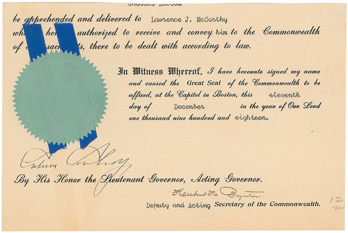 Partial DS, one page, 9 x 6, December 11, 1918. Coolidge signs below the Commonwealth of Massachusetts seal to confirm the apprehension and delivery of Lawrence J. McCarthy. Also signed by Deputy and Acting Secretary of the Commonwealth. Light toning from the ribbon, trimmed edges, and a pencil notation to the bottom right corner, otherwise fine condition. Blue Massachusetts seal is crisp and intact.