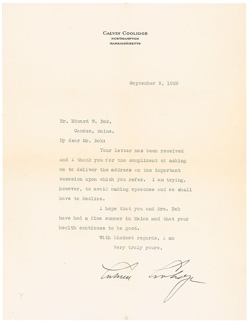 TLS, one page, 8.5 x 11, personal letterhead, September 9, 1929. Letter to Edward W. Bok. In part: “I thank you for the compliment of asking me to deliver the address on the important occasion which you refer. I am trying, however, to avoid making speeches and so shall have to decline.” In fine condition, with intersecting folds, one through a single letter of signature, paperclip impression to top edge, and some scattered light toning.