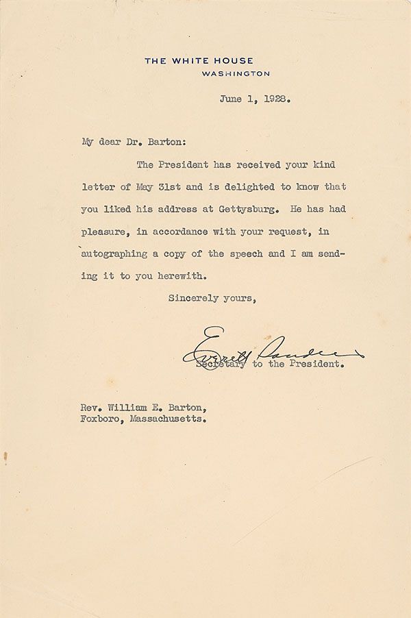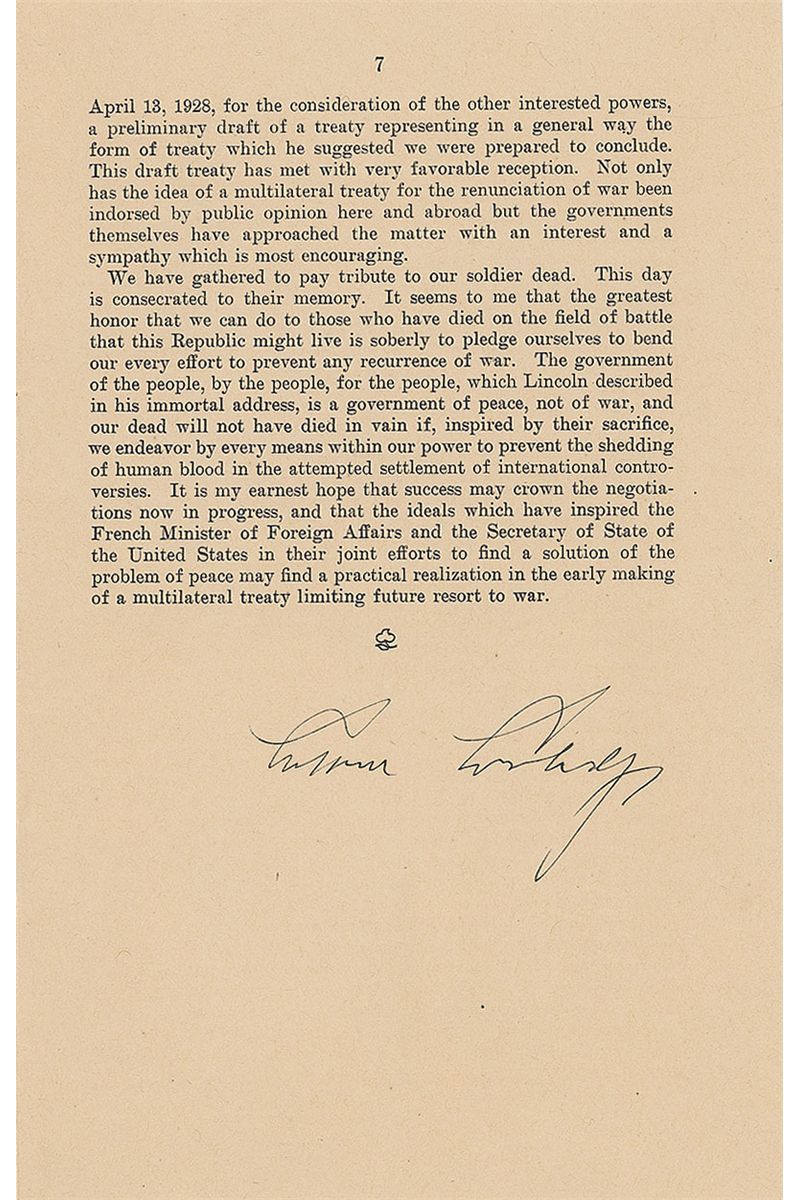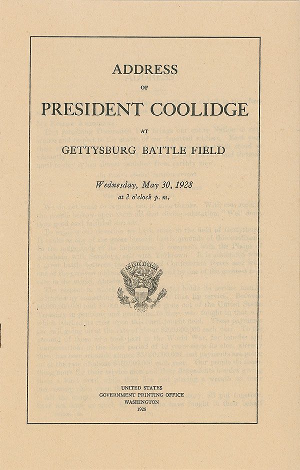 Booklet featuring Coolidge’s speech at Gettysburg on May 30, 1928, published by the US Government Printing Office, 6 x 9, seven pages, signed on the final page in black ink. In fine condition, with mild scattered creases. Accompanied by the original mailing envelope and a letter of transmittal from his secretary.