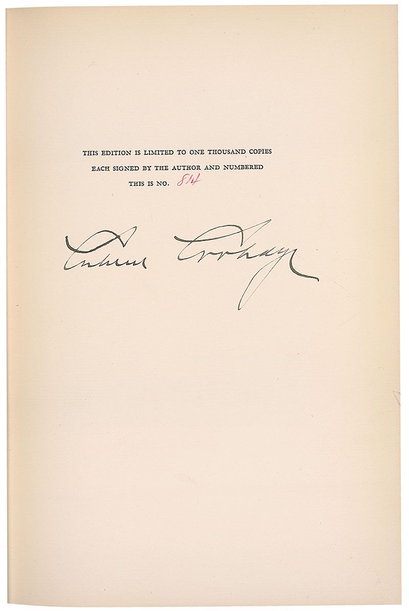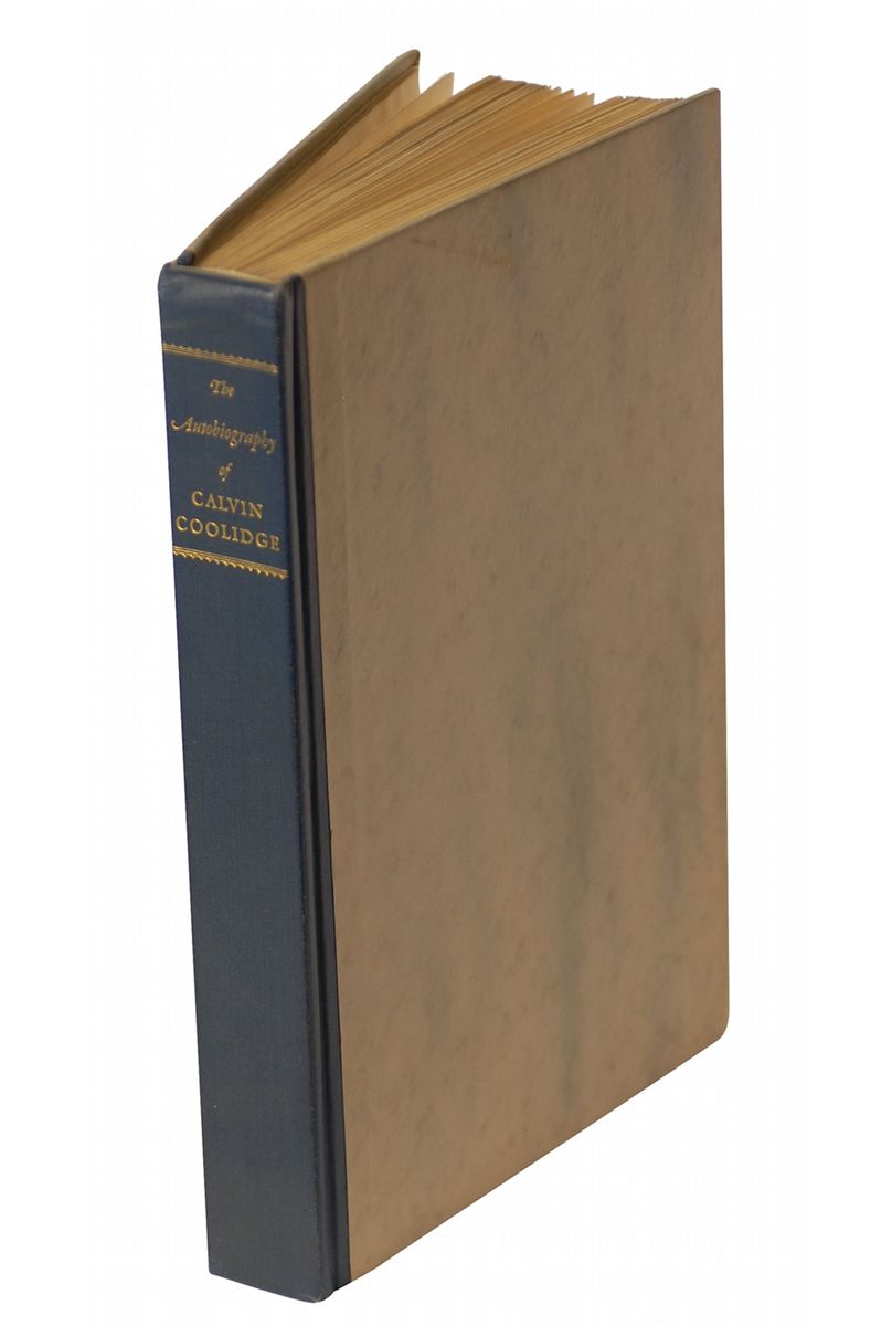 Signed book: The Autobiography of Calvin Coolidge. First edition, limited issue, numbered 814/1000. NY: Cosmopolitan Book Corporation, 1929. Hardcover, 6.25 x 9.5, 247 pages. Boldly signed on the colophon in black ink. Autographic condition: fine. Book condition: VG+/None. Grey paper-covered boards and navy cloth-covered spine, with gilted upper textblock edge; slight wear to edges, mostly at corners and spine-ends; few tiny creases/tears, as expected, to deckled fore-edge; light soiling; previous owner’s small gift inscription to verso of ffep; five relevant clippings glued to rear pastedown and rfeps; one small note to rfep. In protective mylar sleeve.
