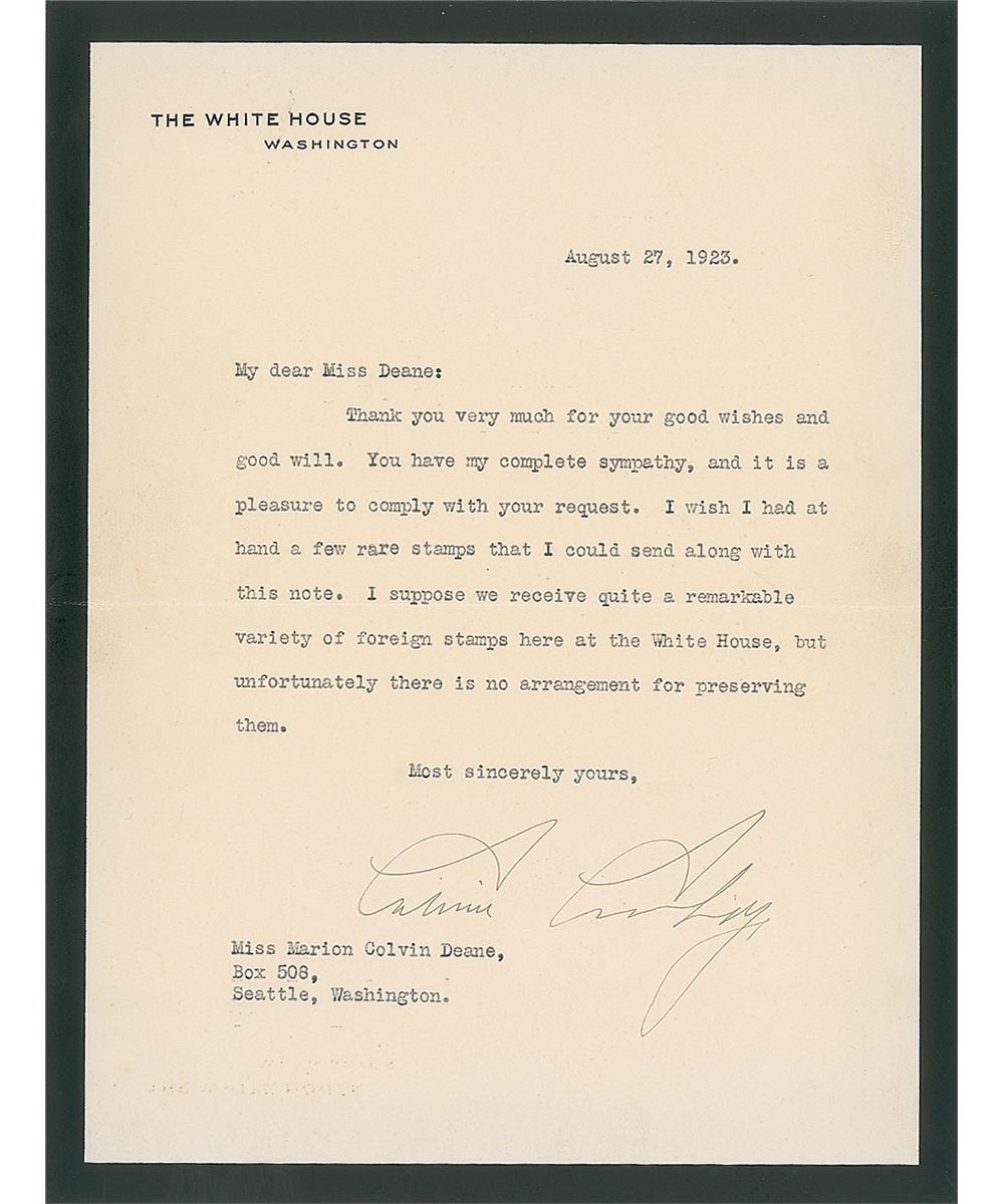 TLS as president, one page, 7 x 9, black-bordered White House letterhead, August 27, 1923. Letter to a collector. In part: “Thank you very much for your good wishes and good will. You have my complete sympathy…I wish I had at hand a few rare stamps that I could send along…I suppose we receive quite a remarkable variety of foreign stamps here at the White House, but unfortunately there is no arrangement for preserving them.” In fine condition. Accompanied by the original mailing envelope and a pre-printed thank you card for sent sympathies to the president and Mrs. Coolidge.