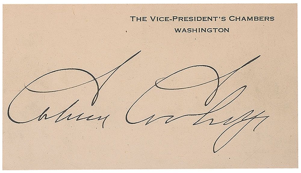Ink signature, “Calvin Coolidge,” on an off-white 4 x 2.25 Vice-President’s Chamber card. In fine condition, with some mild soiling and small mounting remnants to reverse. Being vice president for only a short time, Coolidge did not sign many of these, rendering them much scarcer than his signed White House cards.