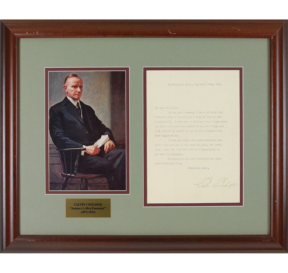 TLS, one page, 7 x 9.75, September 27, 1915. Letter to a supporter. In part: “In the past campaign I have had help from thousands whom I do not know—many of them in your neighborhood. I want you to know how much I appreciate the kind words you have spoken of me, and I hope you will express my thanks to any of your neighbors who have supported me…tell your Committee members—the men who do the work and stand the criticism—that the time has come when Republicans do not have to apologize.” Appealingly double-matted and framed with a nameplate and image to an overall size of 22 x 18. In fine condition, with intersecting folds (one vertical fold passing through a single letter of the signature). Accompanied by a full letter of authenticity from PSA/DNA.