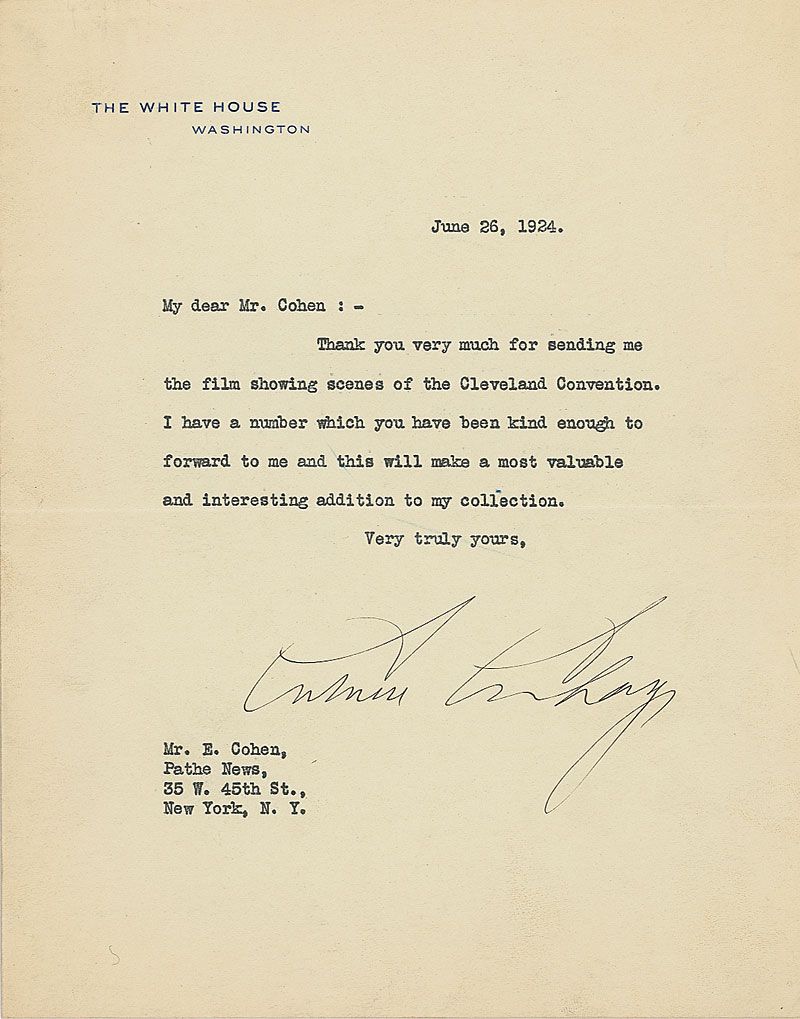 TLS, one page, 7 x 8.75, White House letterhead, June 26, 1924. Letter to Emanuel Cohen at Pathe News in New York. In full: “Thank you very much for sending me the film showing scenes of the Cleveland Convention. I have a number which you have been kind enough to forward to me and this will make a most valuable and interesting addition to my collection.” In fine condition. Accompanied by the original White House transmittal envelope. The 1924 Republican National Convention was held in Cleveland, where the incumbent President Coolidge was formally nominated as the party’s candidate for the upcoming election. Cohen went on to become a Hollywood producer, earning credits on films such as Go West Young Man and Every Day's a Holiday, both starring Mae West.