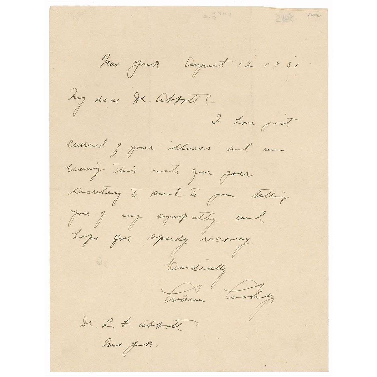 ALS, one onionskin page, 8 x 10.25, August 12, 1931. Letter to Dr. Lyman Abbott. In full: “I have just learned of your illness and am leaving this note for your secretary to send to you telling you of my sympathy and hope for speedy recovery.” In fine condition, with intersecting folds, one through a single letter of signature, and some scattered light creases.