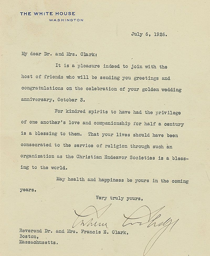 TLS as president, one page, 6.25 x 7.5, White House letterhead, July 6, 1926. Letter to Francis Edward Clark and his wife. In part: “Congratulations on the celebration of your golden wedding anniversary, October 3. For kindred spirits to have had the privilege of one another’s love and companionship for half a century is a blessing to them. That your lives should have been concentrated to the service of religion through such an organization as the Christian Endeavor Societies is a blessing to the world.” Affixed to a slightly larger sheet. In fine condition.