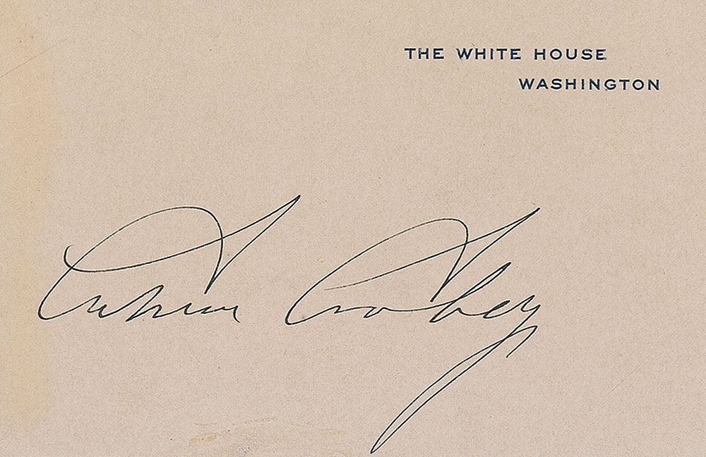 White House card crisply signed in black ink, “Calvin Coolidge.” In fine condition, with a slight scuff to the lower edge and a subtle band of toning to left edge from a thin mounting strip affixed to the reverse.