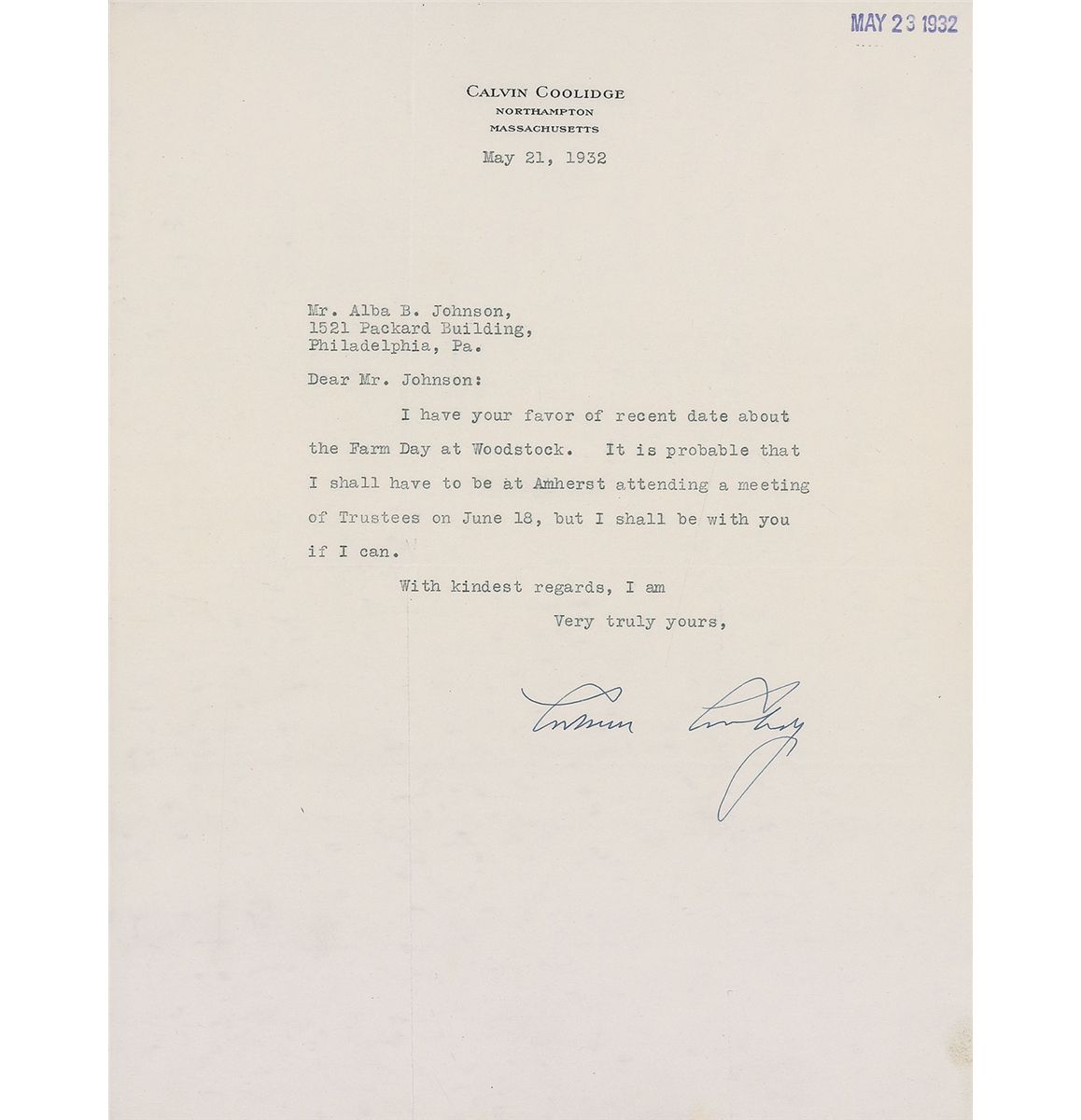 TLS, one page, 8.5 x 11, personal letterhead, May 21, 1932. Letter to Alba Johnson. In full: “I have your favor of recent date about the Farm Day at Woodstock. It is probable that I shall have to be at Amherst attending a meeting of Trustees on June 28, but I shall be with you if I can.” In fine condition, with intersecting storage folds, one through a single letter of signature, and an office stamp to top right corner.