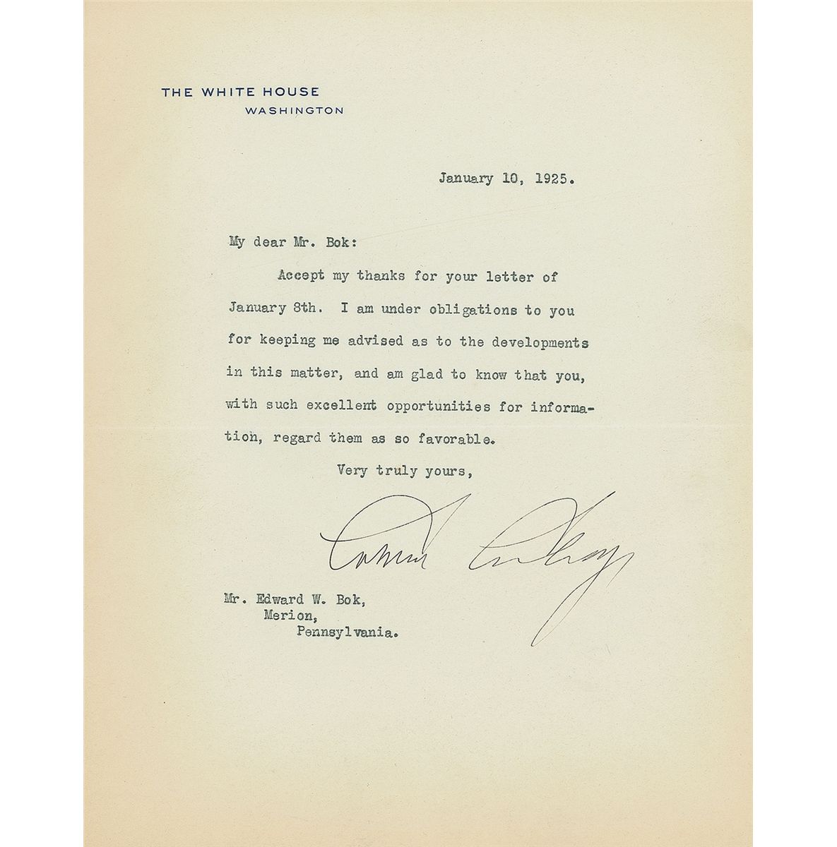 TLS as president, one page, 7 x 8.75, White House letterhead, January 10, 1925. Letter to Edward W. Bok. In part: “I am under obligations to you for keeping me advised as to the developments in this matter, and am glad to know that you with such excellent opportunities for information, regard them as so favorable.” In fine condition, with subtle toning. Bok was the editor of Ladies’ Home Journal from 1889 to 1919, building it into the world’s most widely circulated magazine.