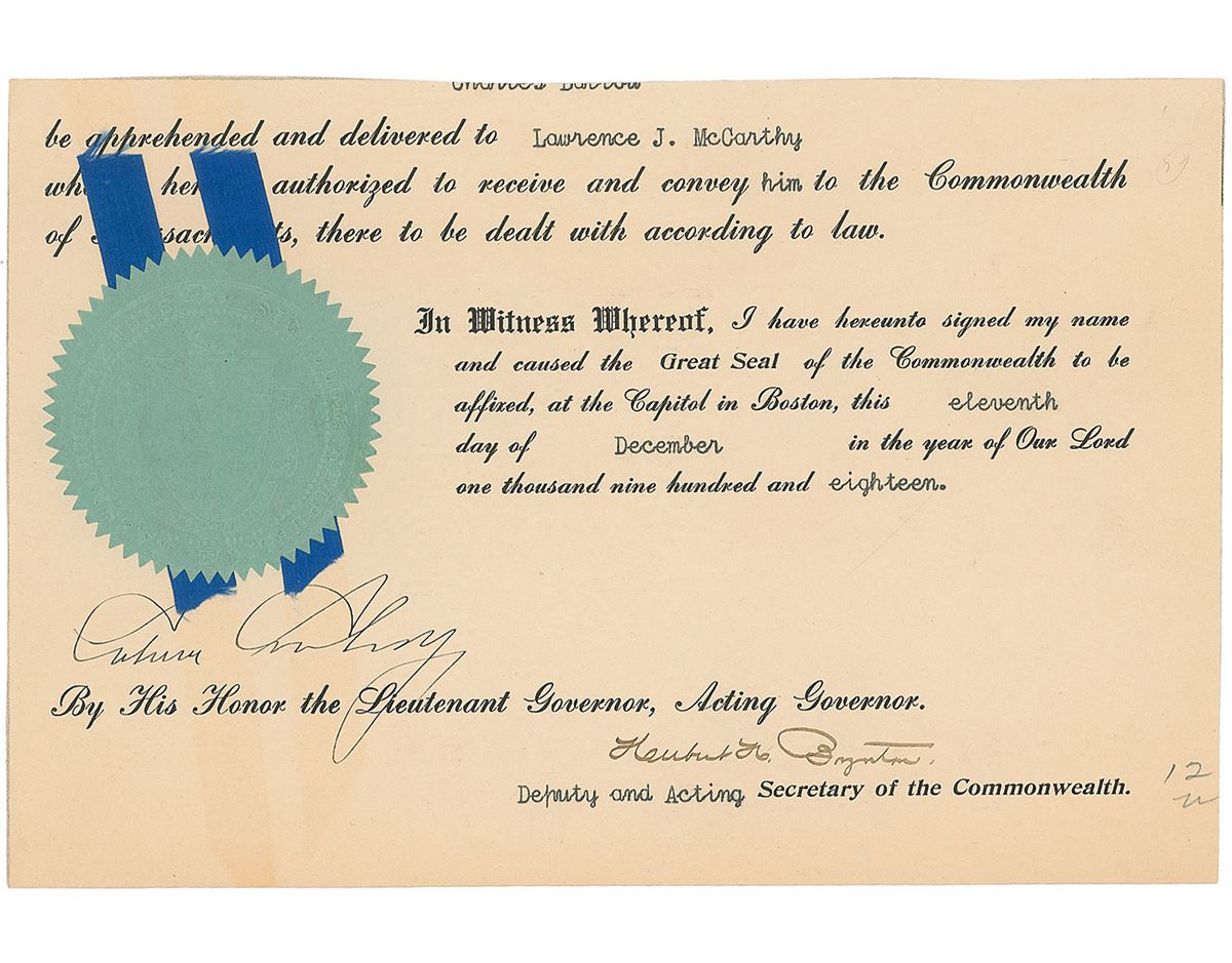 Partial DS, one page, 9 x 6, December 11, 1918. The concluding portion of a document in which Coolidge, as acting governor of Massachusetts, confirms a demand that someone “be apprehended and delivered to Lawrence J. McCarthy.” Signed below the crisply embossed blue seal by Coolidge and countersigned by an acting secretary. Light toning and trimmed edges, otherwise fine condition.