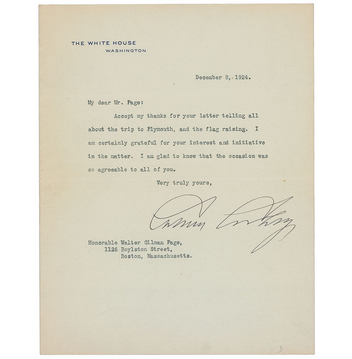 TLS as president, one page, 7 x 8.75, White House letterhead, December 8, 1924. Letter to Walter Page, in full: “Accept my thanks for your letter telling all about the trip to Plymouth, and the flag raising. I am certainly grateful for your interest and initiative in the matter. I am glad to know that the occasion was so agreeable to all of you.” In fine condition, with a faint horizontal fold passing through the signature.