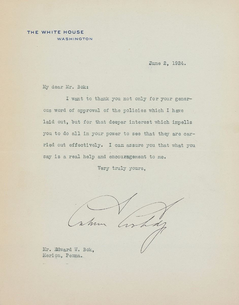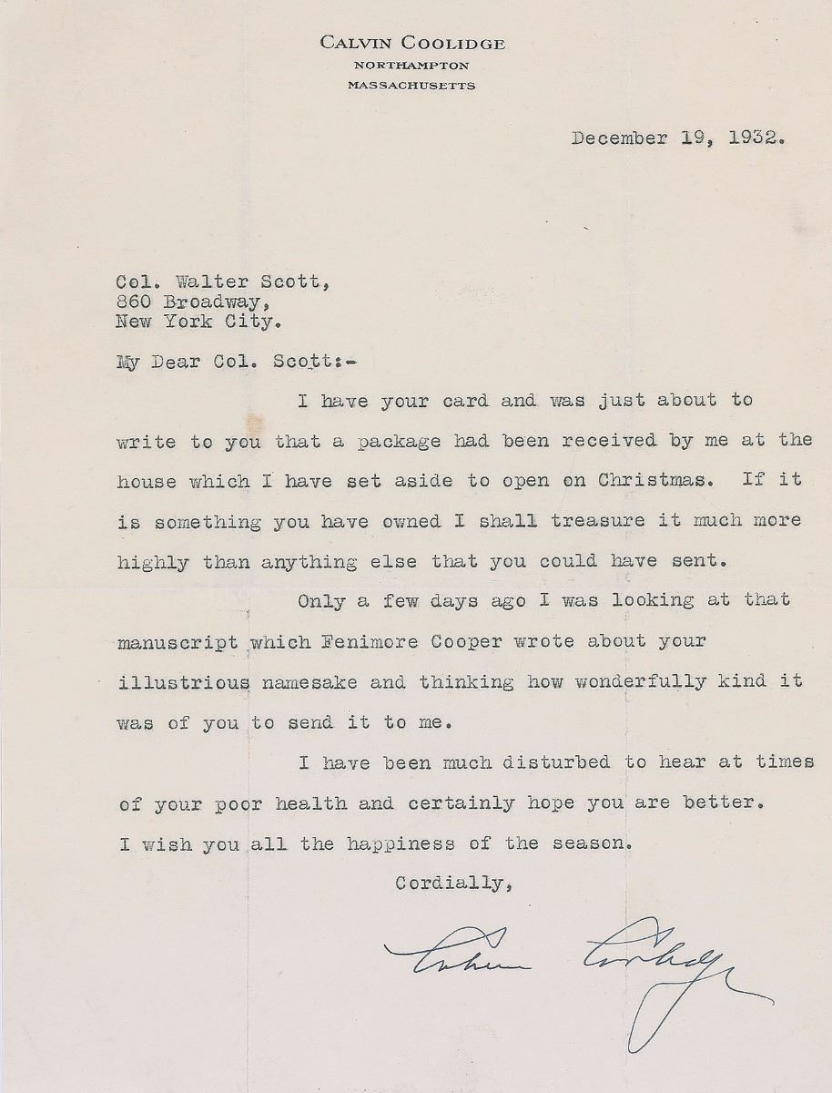 Two letters: first, a TLS as president, one page, 7 x 8.75, White House letterhead, June 2, 1924. Letter to longtime Ladies’ Home Journal editor, Edward Bok, in full: “I want to thank you not only for your generous word of approval of the policies which I have laid out, but for that deeper interest which impells you to do all in your power to see that they are carried out effectively. I can assure you that what you say is a real help and encouragement to me.” Second, a TLS, one page, 7 x 9.25, personal letterhead, December 19, 1932. Letter to Massachusetts merchant and philanthropist Col. Walter Scott, in part: “Only a few days ago I was looking at that manuscript which Fenimore Cooper wrote about your illustrious namesake and thinking how wonderfully kind it was of you to send it to me. I have been much disturbed to hear at times of your poor health and certainly hope you are better.” Concerned for his friend’s health, Coolidge himself would pass away only seventeen days after writing this letter. In overall fine condition, with a spot of soiling and intersecting folds (one vertical fold passing through a single letter of the signature) to the letter dated 1932.