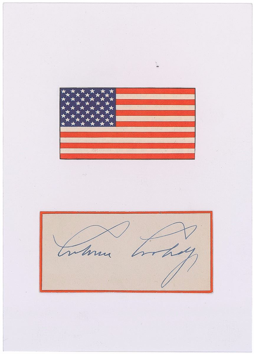 Ink signature, “Calvin Coolidge,” on an off-white 2.75 x 1.25 slip affixed to a slightly larger orange card. The card is affixed to a white 4 x 5.75 sheet bearing a small American flag. In fine condition.