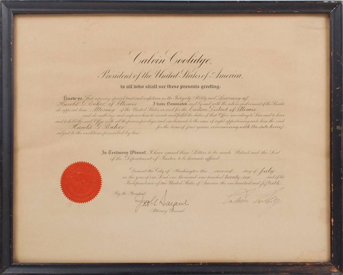 Partly-printed DS as president, one page, 18.5 x 14.5, July 2, 1926. President Coolidge appoints Harold G. Baker of Illinois as “Attorney of the United States in and for the Eastern District of Illinois.” Crisply signed at the conclusion by President Coolidge and countersigned by Attorney General John G. Sargent. The red seal affixed to the lower left remains fully intact. Framed in a period frame and in fine condition, with a few mild stains to edges.