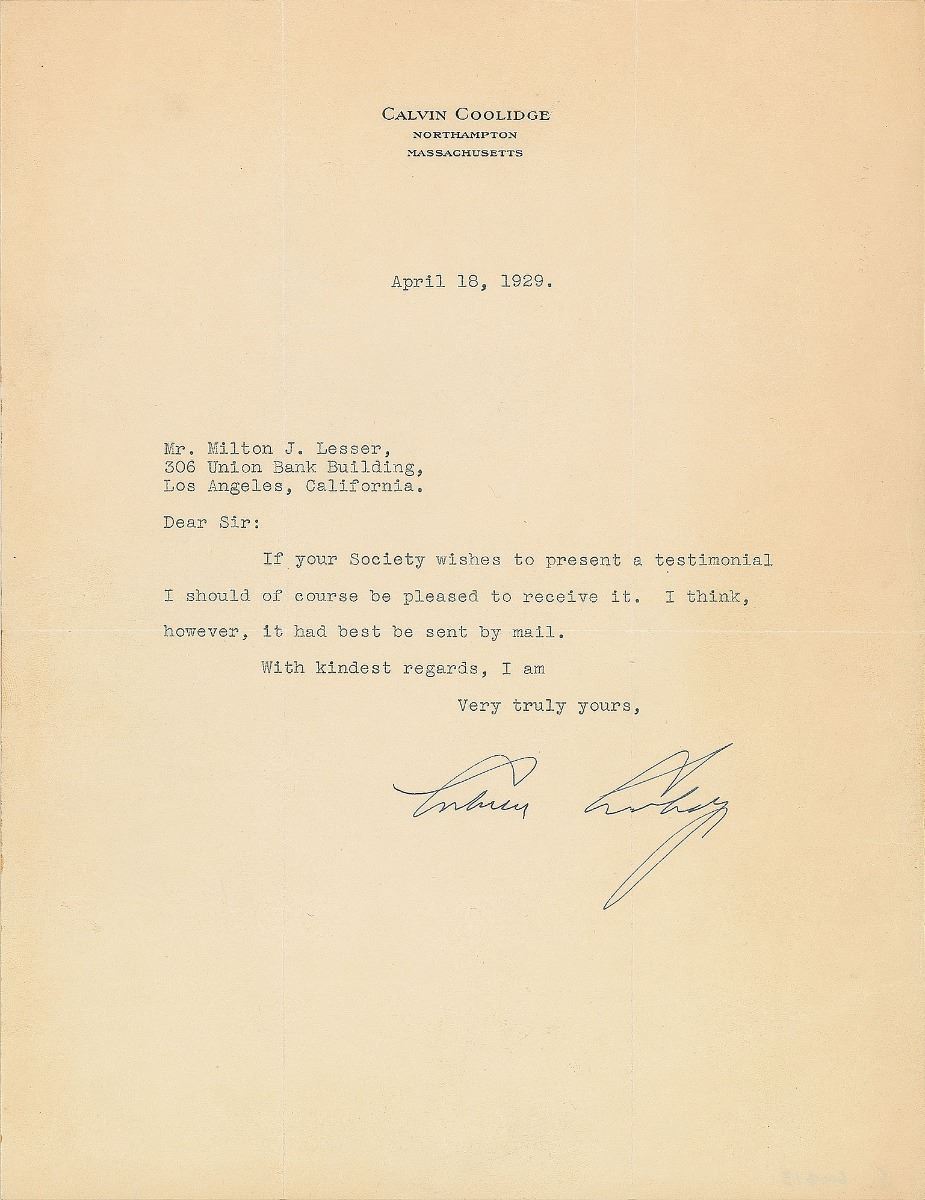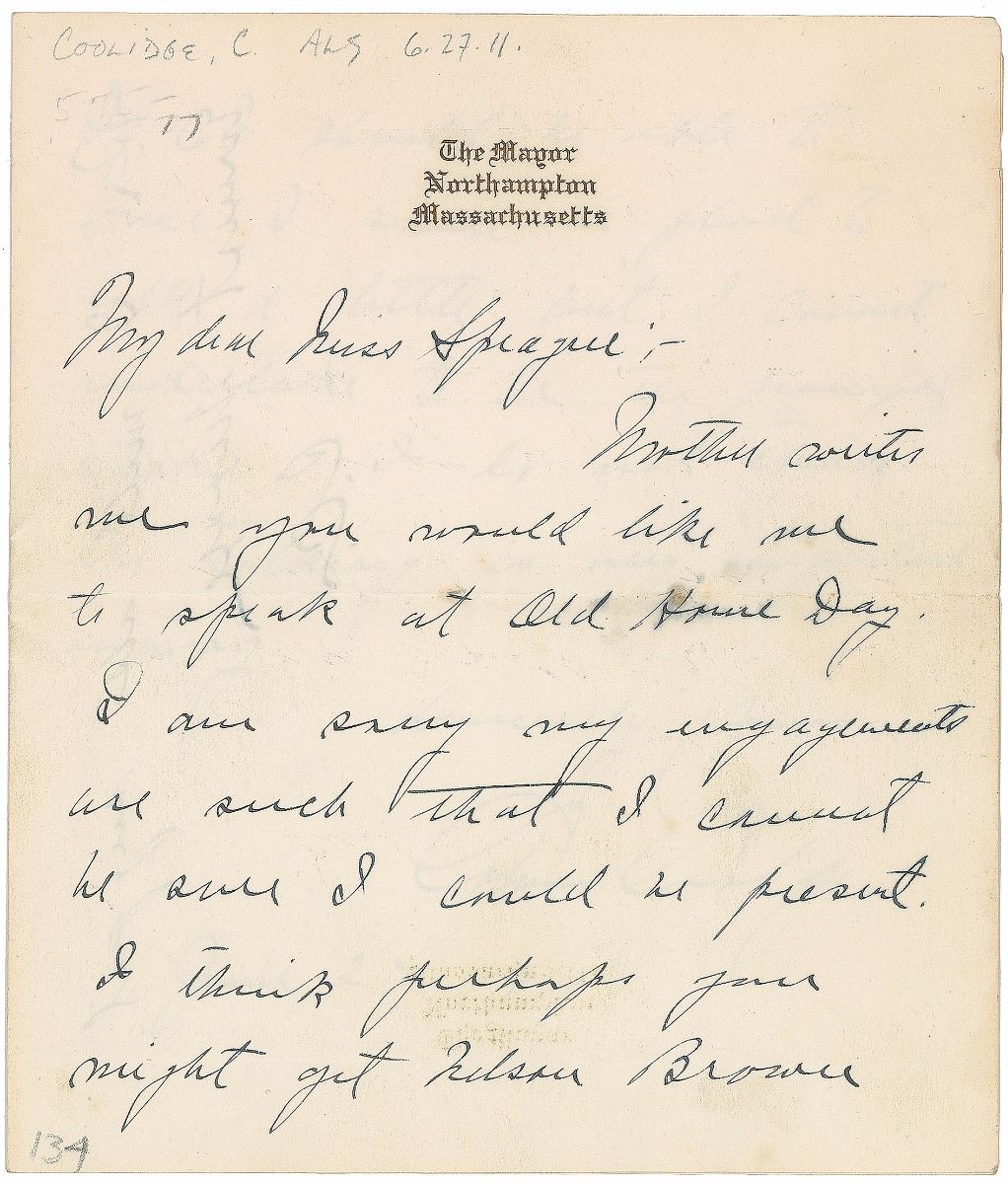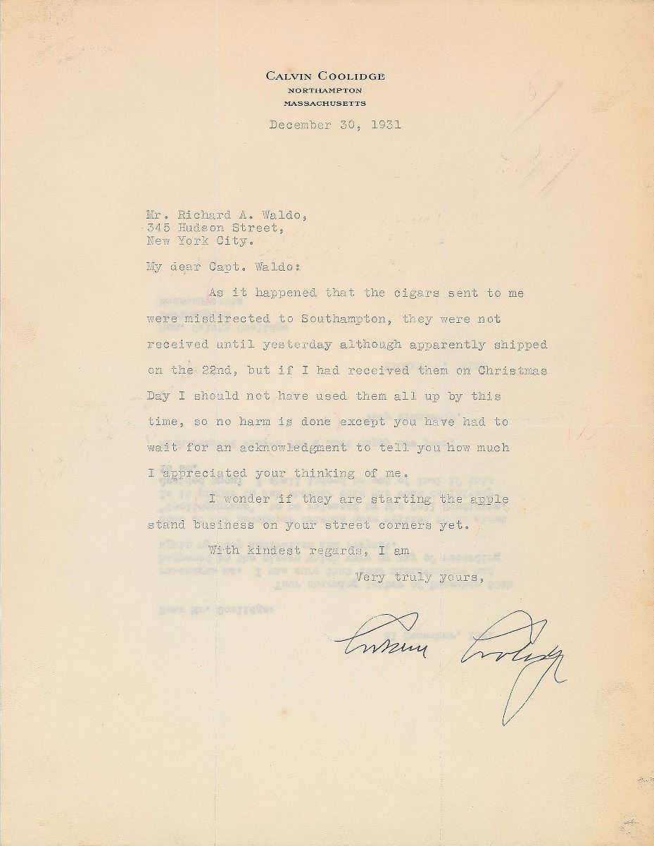 Collection of three letters, including a scarce ALS and two TLSs, dated from 1911 to 1931. The ALS, three pages on two adjoining sheets, June 27, 1911, in part: “Mother writes me you would like me to speak at Old House Day…I cannot be sure I could be present…If I should be able to come I shall be glad to talk a little but I cannot undertake to be the principle speaker. I do not think the talking is very important anyway…P.S. I will also suggest Ernest Moore. C. C.” The second, from 1929, responds to a society wishing to present a testimonial; the third, from 1931, refers to cigars sent as a Christmas present. In very good to fine condition, with scattered light staining from onetime exposure to moisture and overall wrinkling and creasing to the ALS. Accompanied by the original mailing envelope for the ALS.