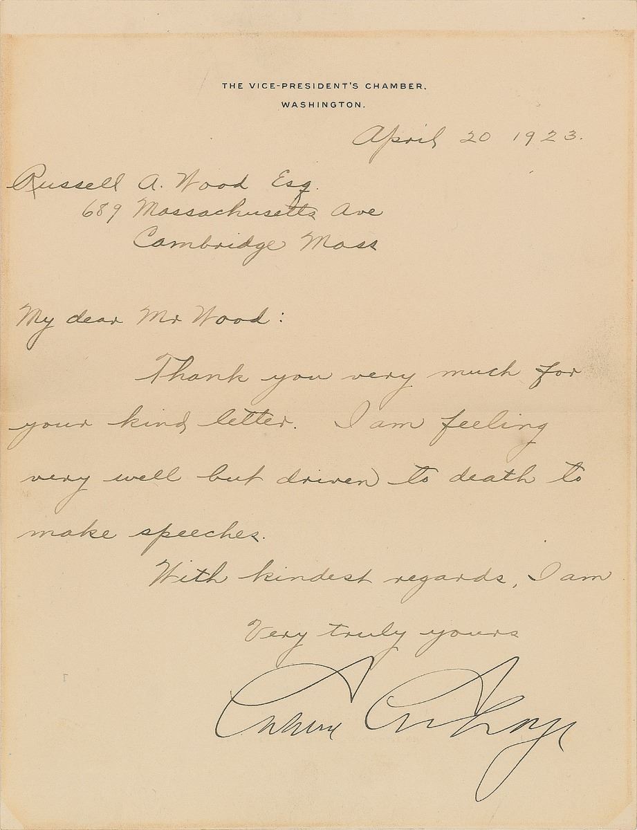 LS, one page, 7 x 9, The Vice-President’s Chamber letterhead, April 20, 1923. Letter to Russell A. Wood in Cambridge, Massachusetts. In full: “Thank you very much for your kind letter. I am feeling very well but driven to death to make speeches.” In fine condition, with a light block of toning from prior display. Accompanied by an unsigned photo. A fine example connected to the taciturn president’s famous nickname, ‘Silent Cal.’