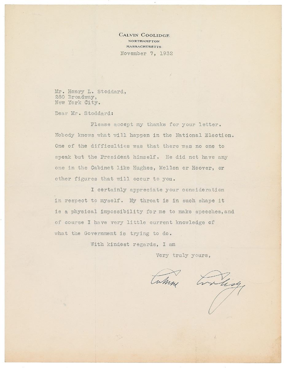 TLS, one page, 8.5 x 11, personal letterhead, November 7, 1932. Letter to New York Evening Mail editor Henry L. Stoddard, in full: “Please accept my thanks for your letter. Nobody knows what will happen in the National Election. One of the difficulties was that there was no one to speak but the President himself. He did not have any one in the Cabinet like Hughes, Mellon or Hoover, or other figures that will occur to you. I certainly appreciate your consideration in respect to myself. My throat is in such shape it is a physical impossibility for me to make speeches, and of course I have very little current knowledge of what the Government is trying to do.” In fine condition.
