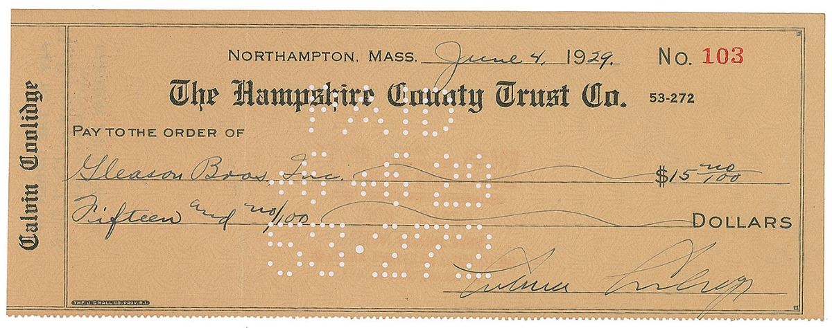 Personal check, 8 x 3, filled out in another hand and signed by Coolidge, payable to Gleason Bros. Inc. for $15, June 4, 1929. In fine condition. Coolidge was just two months removed from the presidency at the time of signing.