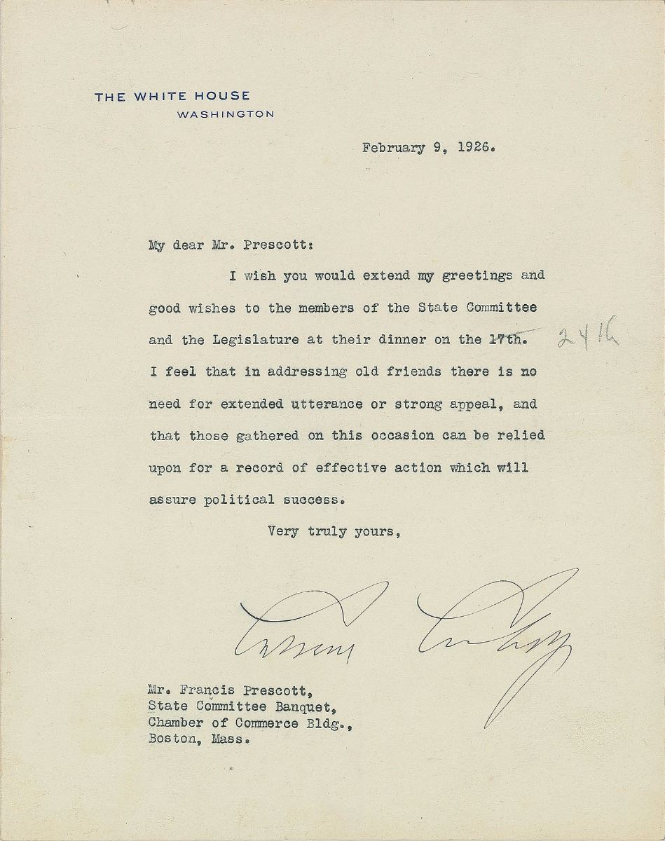 TLS as president, one page, 7 x 8.75, White House letterhead, February 9, 1926. Letter to Francis Prescott, in full: "I wish you would extend my greetings and good wishes of the State Committee and the Legislature at their dinner on the 17th. I feel that in addressing old friends there is no need for extended utterance or strong appeal, and that those gathered on this occasion can be relied upon for a record of effective action which will assure political success." An unknown hand has corrected the date of the aforementioned dinner. In fine condition. Accompanied by a full letter of authenticity from PSA/DNA.