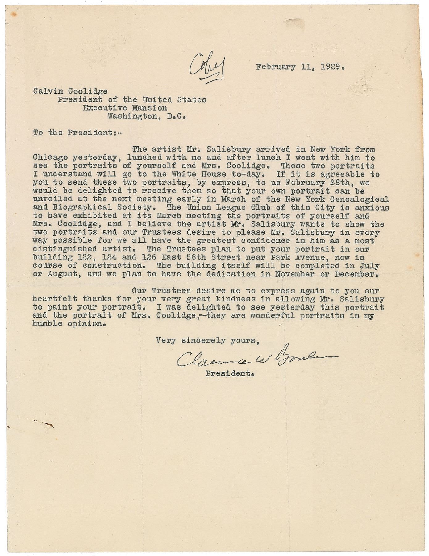 Scarce ALS as president, 7 x 8.75, White House letterhead, February 14, 1929. Letter to artist Frank O. Salisbury, who painted a portrait of Coolidge in addition to other presidents. In full: “The portraits of Mrs. Coolidge and myself have come and we are much pleased with them. You have all the permission I can give to exhibit them anywhere. Please accept my thanks for all your service and care.” In fine condition. Accompanied by an original unsigned matte-finish photo of Coolidge, Salisbury, and the portrait, as well as a letter from Clarence Bonham about exhibiting the portraits. Born in England, Salisbury was considered one of the greatest society artists of his generation—his subjects included six American presidents, Winston Churchill, Queen Elizabeth II, and scores of other notable figures. Coolidge’s autograph letters as president are very scarce, especially with such interesting content.