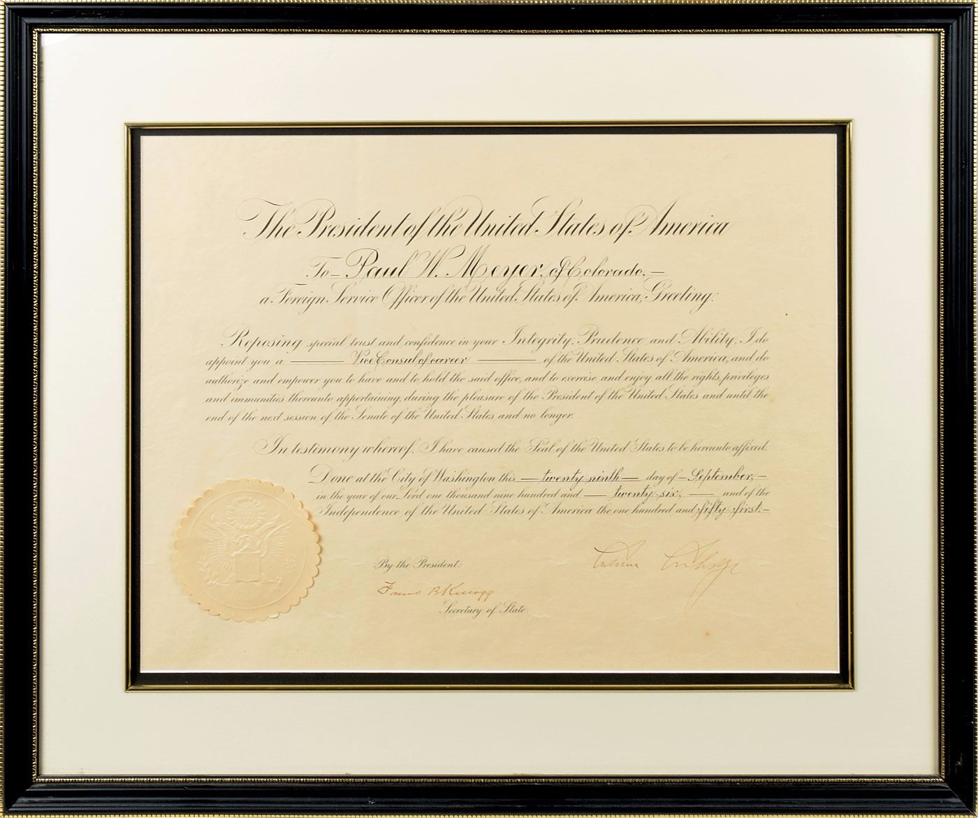 Partly-printed DS as president, one page, 17.5 x 13.5, September 29, 1926. President Coolidge appoints Paul W. Meyer of Colorado as "Vice Consul of career of the United States of America." Large white paper seal remains affixed to lower left. Matted and framed to an overall size of 24.25 x 20.25. In fine condition, with right edge of frame loose.