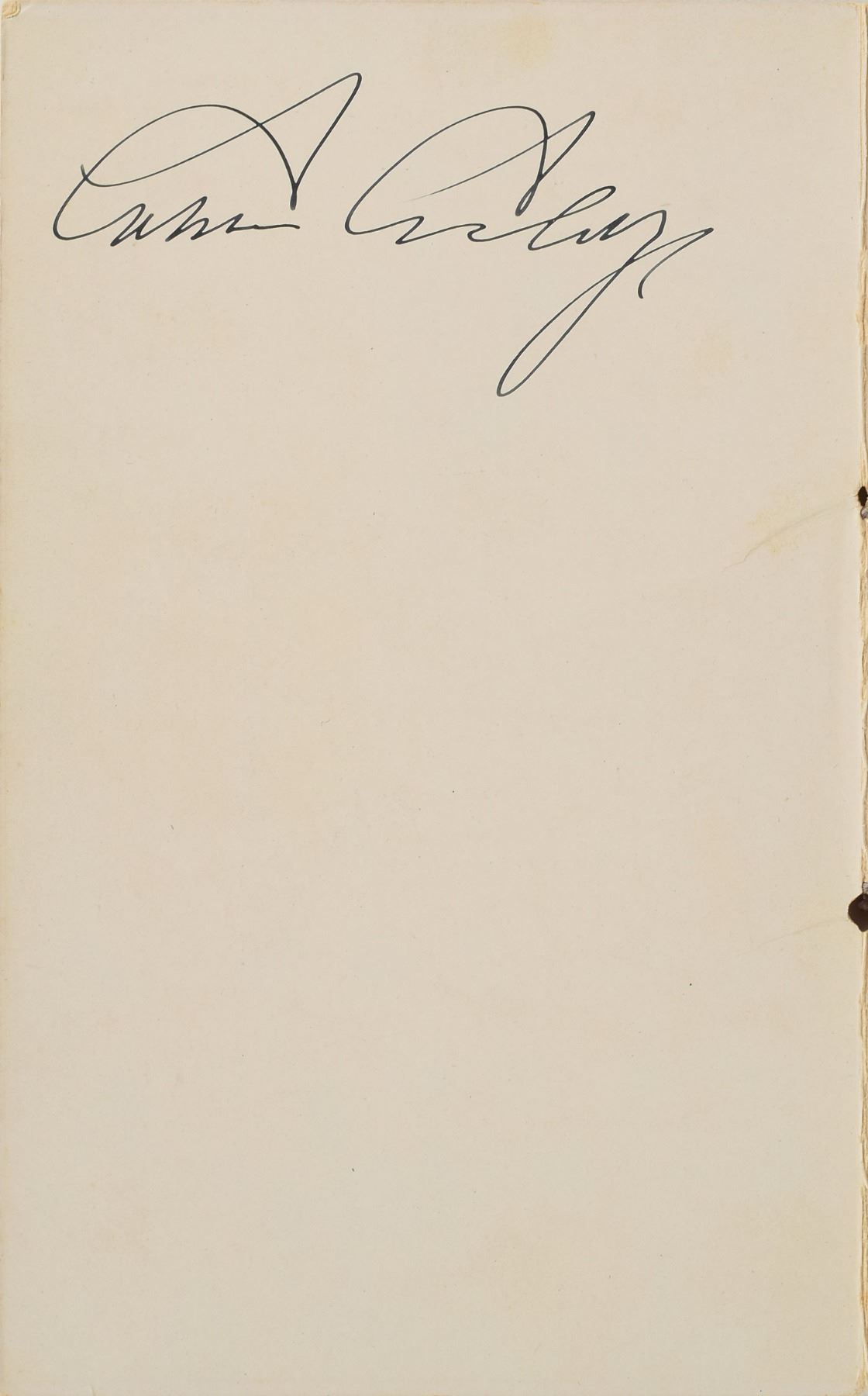 Menu booklet for a testimonial dinner in honor of Frank B. Hall at the Hotel Vendome in Boston on February 18, 1921, 4.5 x 7.25, four pages, signed on the inside of the front cover in black ink by Coolidge. Also signed on the front cover in fountain pen by Hall, who adds the date, "Feb. 18–1921." In very good to fine condition, with light creasing and soiling to the covers.