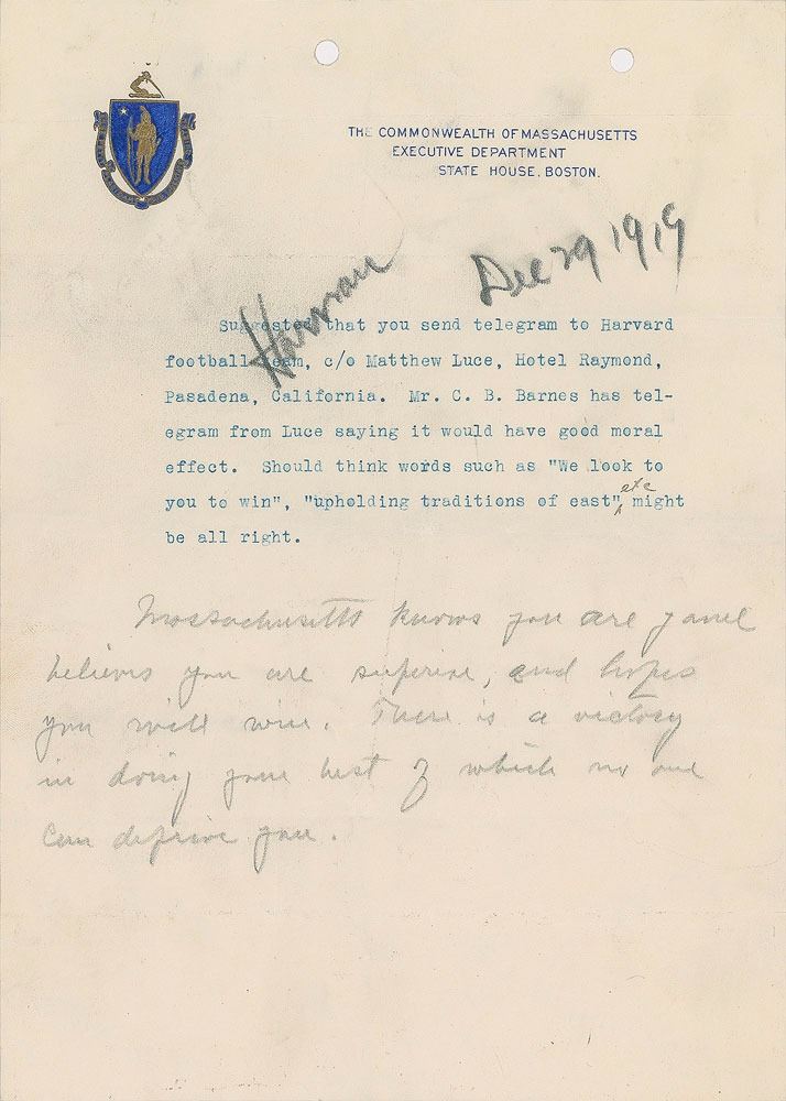 Handwritten note as governor, unsigned, one page, 7.5 x 10.5, Commonwealth of Massachusetts letterhead, annotated December 29, 1919. A typed message from an aide reads, "Suggested that you send telegram to Harvard football team, c/o Matthew Luce, Hotel Raymond, Pasadena, California. Mr. C. B. Barnes has telegram from Luce saying it would have good moral effect. Should think words such as 'We look to you to win,' 'upholding traditions of east,' etc. might be all right." Coolidge's handwritten draft of his message to the team is written below in pencil, in full: "Massachusetts knows you are game, believes you are superior, and hopes you will win. There is a victory in doing your best of which no one can deprive you." In fine condition, with intersecting folds and file holes at the top. Harvard defeated Oregon in the game by a score of 7-6, their only Rose Bowl victory.