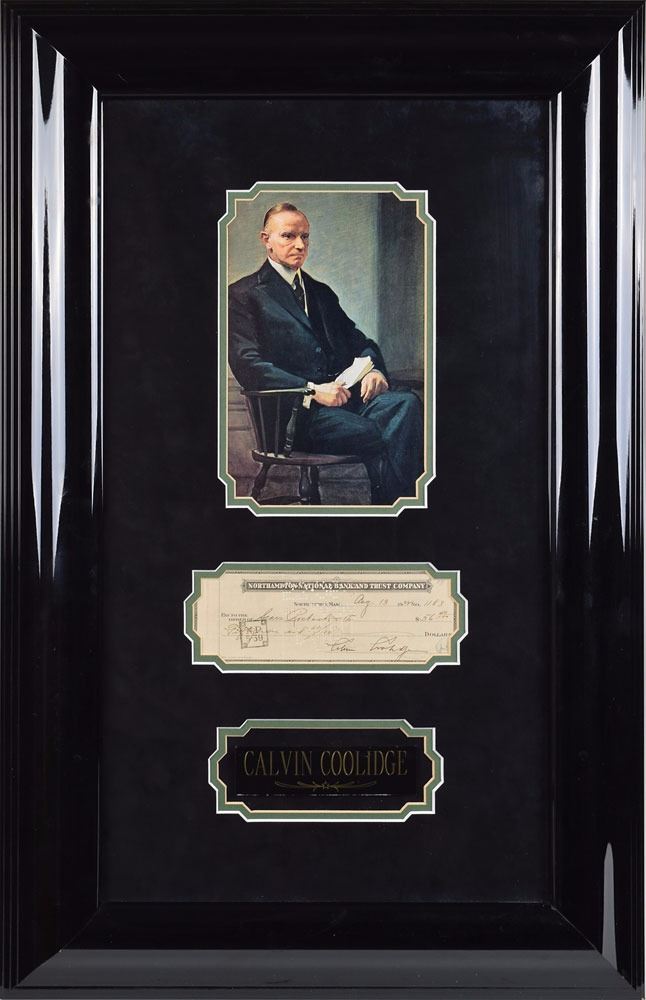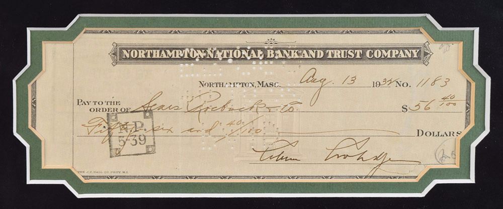 Northampton National Bank check, 8 x 2.75, filled out in another hand and signed by Coolidge, "Calvin Coolidge," payable to Sears Roebuck & Co. for $56.40, August 13, 1932. Impressively double-matted and framed with a plaque and portrait to an overall size of 19.5 x 30.5. In fine condition.