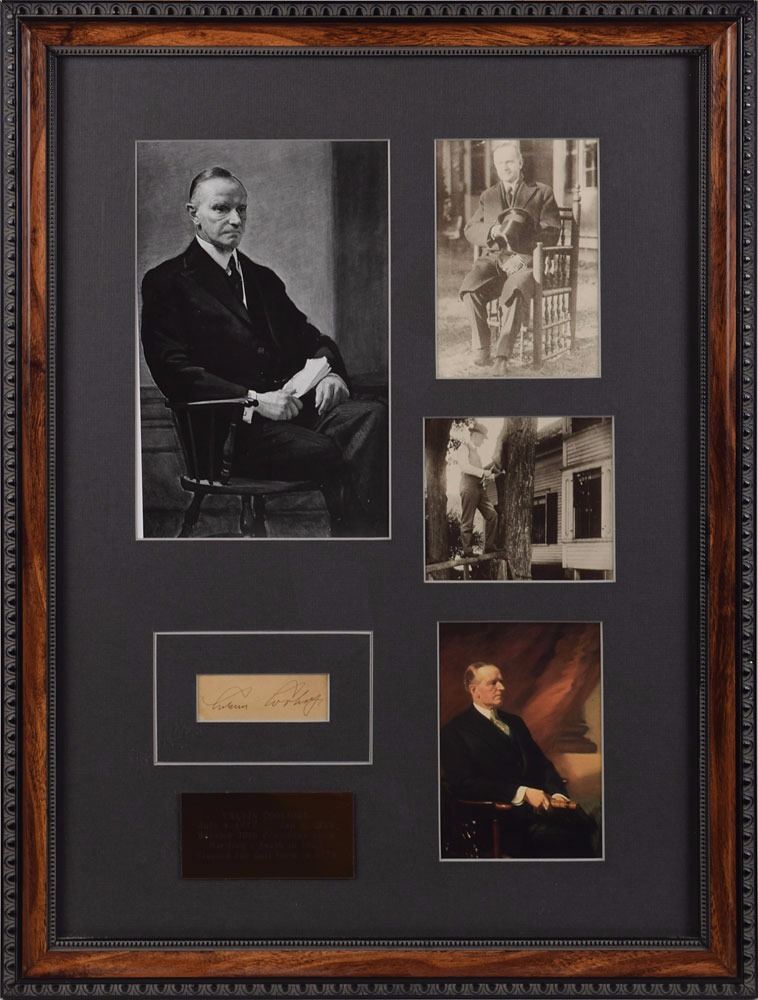 Ink signature, "Calvin Coolidge,” on an off-white 3 x 1 slip. Impressively matted and framed with a plaque and four images to an overall size of 17.5 x 23. In fine condition, with bits of old tape to two corners.