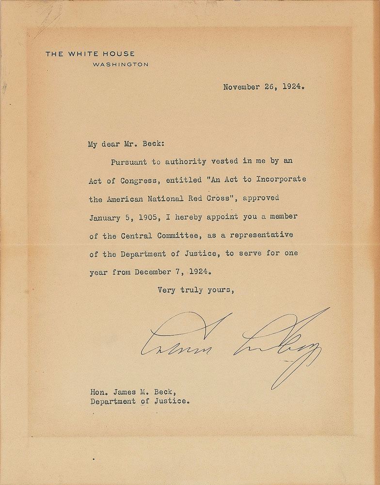 TLS as president, one page, White House letterhead, November 26, 1924. Letter to James M. Beck of the Department of Justice, in full: "Pursuant to authority vested in me by an Act of Congress, entitled 'An Act to Incorporate the American National Red Cross,' approved January 5, 1905, I hereby appoint you a member of the Central Committee, as a representative of the Department of Justice, to serve for one year from December 7, 1924." In very good condition, with a paperclip impression to the upper left corner, and toning from prior display.