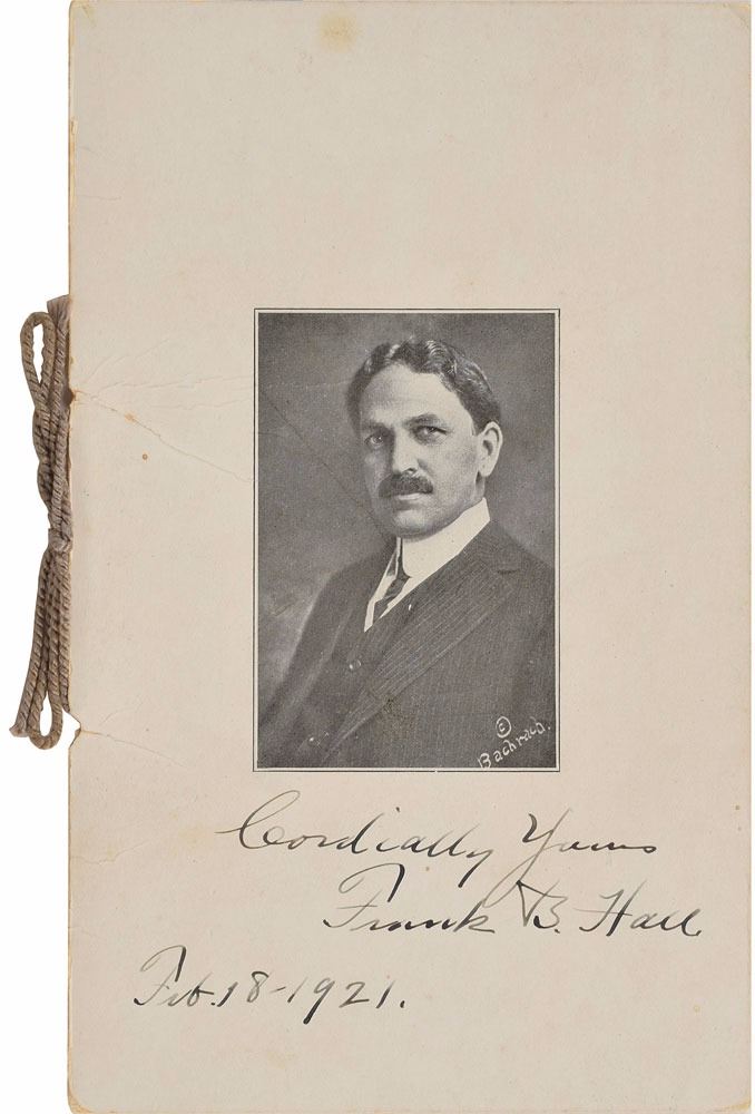 Menu booklet for a testimonial dinner in honor of Frank B. Hall at the Hotel Vendome in Boston on February 18, 1921, 4.5 x 7.25, four pages, signed on the inside of the front cover in black ink by Coolidge. Also signed on the front cover in fountain pen by Hall, who adds the date, "Feb. 18–1921." In very good to fine condition, with light creasing and soiling to the covers.
