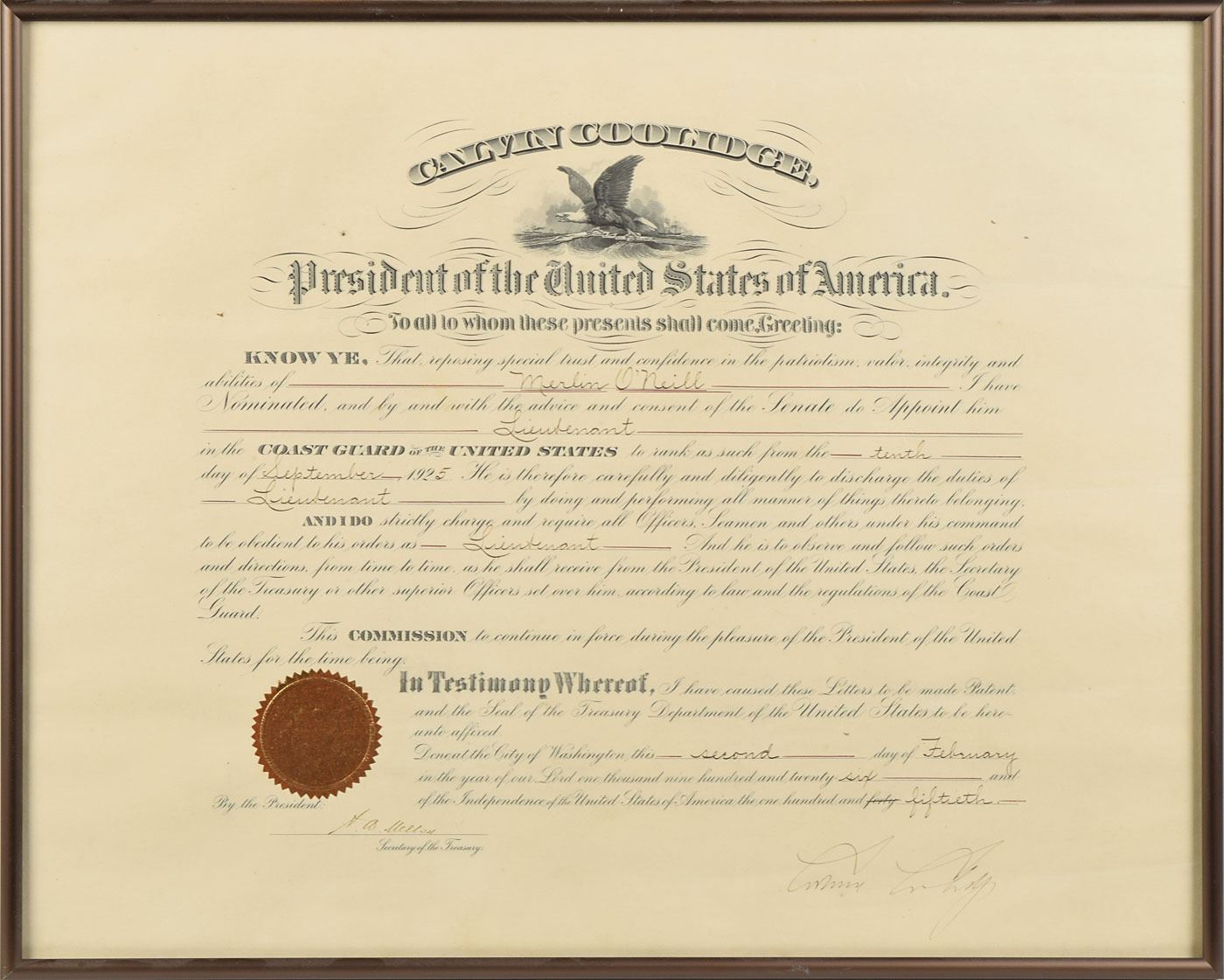 Partly-printed DS as president, one page, 19.5 x 15.5, February 2, 1926. President Coolidge appoints Merlin O’Neill as “Lieutenant in the Coast Guard of the United States.” Signed at the conclusion by Coolidge, and countersigned by Secretary of the Treasury Andrew W. Mellon. Gold foil seal remains affixed to lower left corner. Framed and in fine condition.
