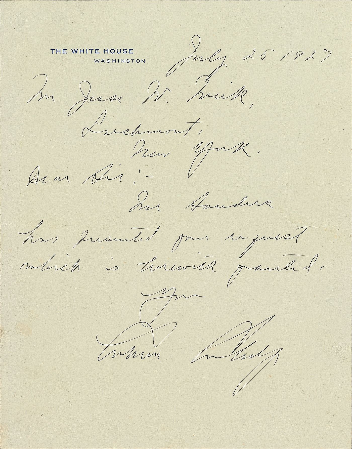 Scarce ALS as president, one page, 7 x 8.75, White House letterhead, July 25, 1927. Letter to a gentleman in Larchmont, New York, in full: "Mr. Sanders has presented your request which is herewith granted." In fine condition. Accompanied by an unsigned engraving.