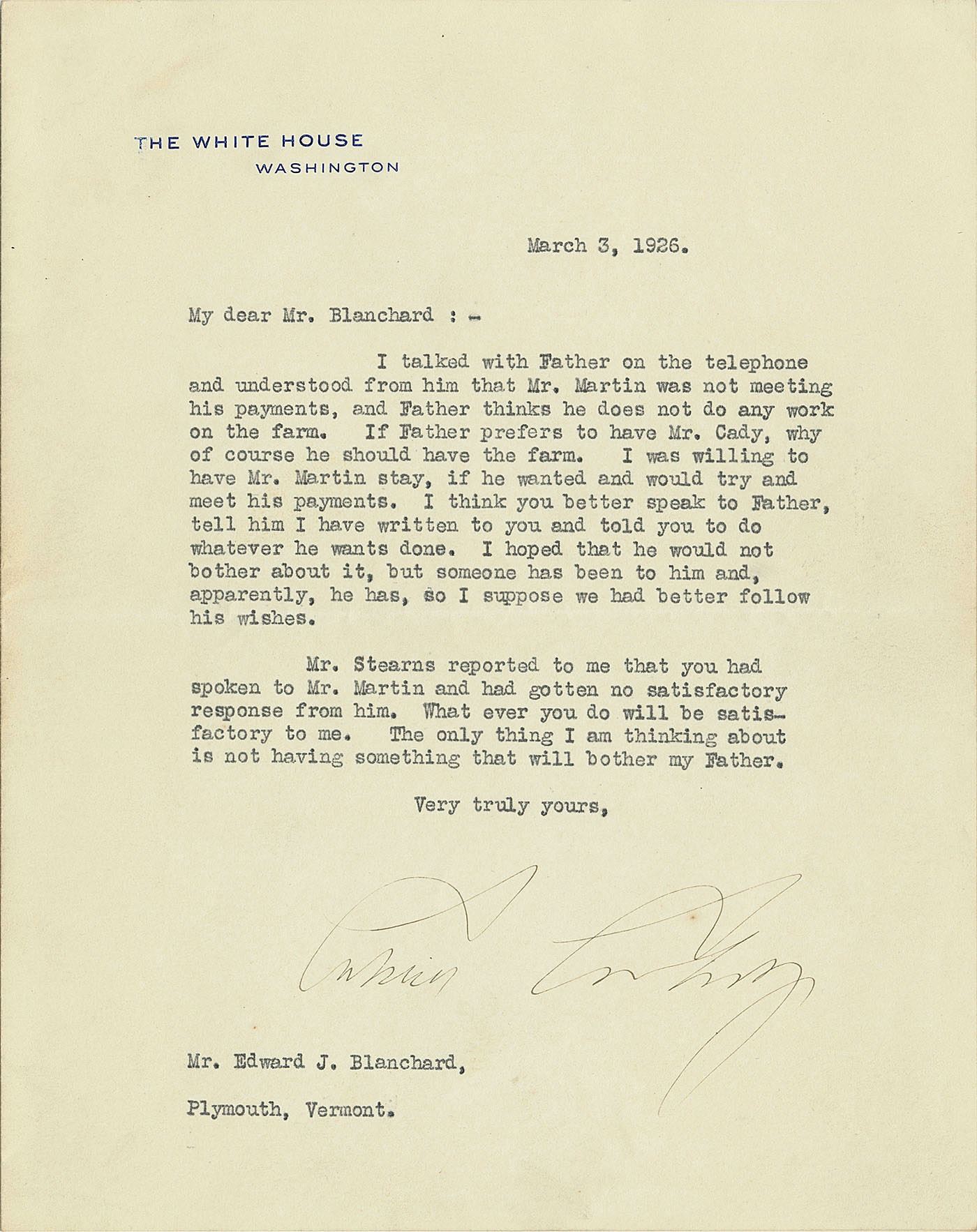 TLS as president, one page, 7 x 8.75, White House letterhead, March 3, 1926. Letter to Edward J. Blanchard in Vermont, concerning his father's property. In part: "I talked with Father on the telephone and understood from him that Mr. Martin was not meeting his payments, and Father thinks he does not do any work on the farm. If Father prefers to have Mr. Cady, why of course he should have the farm. I was willing to have Mr. Martin stay, if he wanted and would try and meet his payments…What ever you do will be satisfactory to me. The only thing I am thinking about is not having something that will bother my Father." In fine condition, with the signature a few shades light. The elder Coolidge passed away just weeks later, on March 18, 1926.