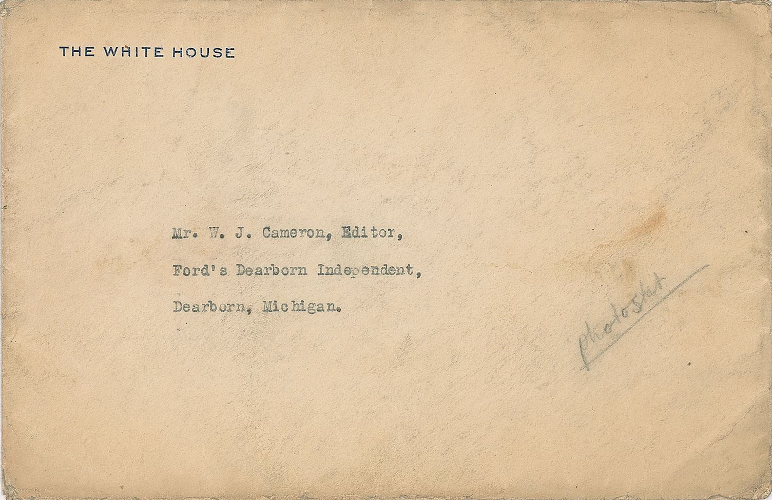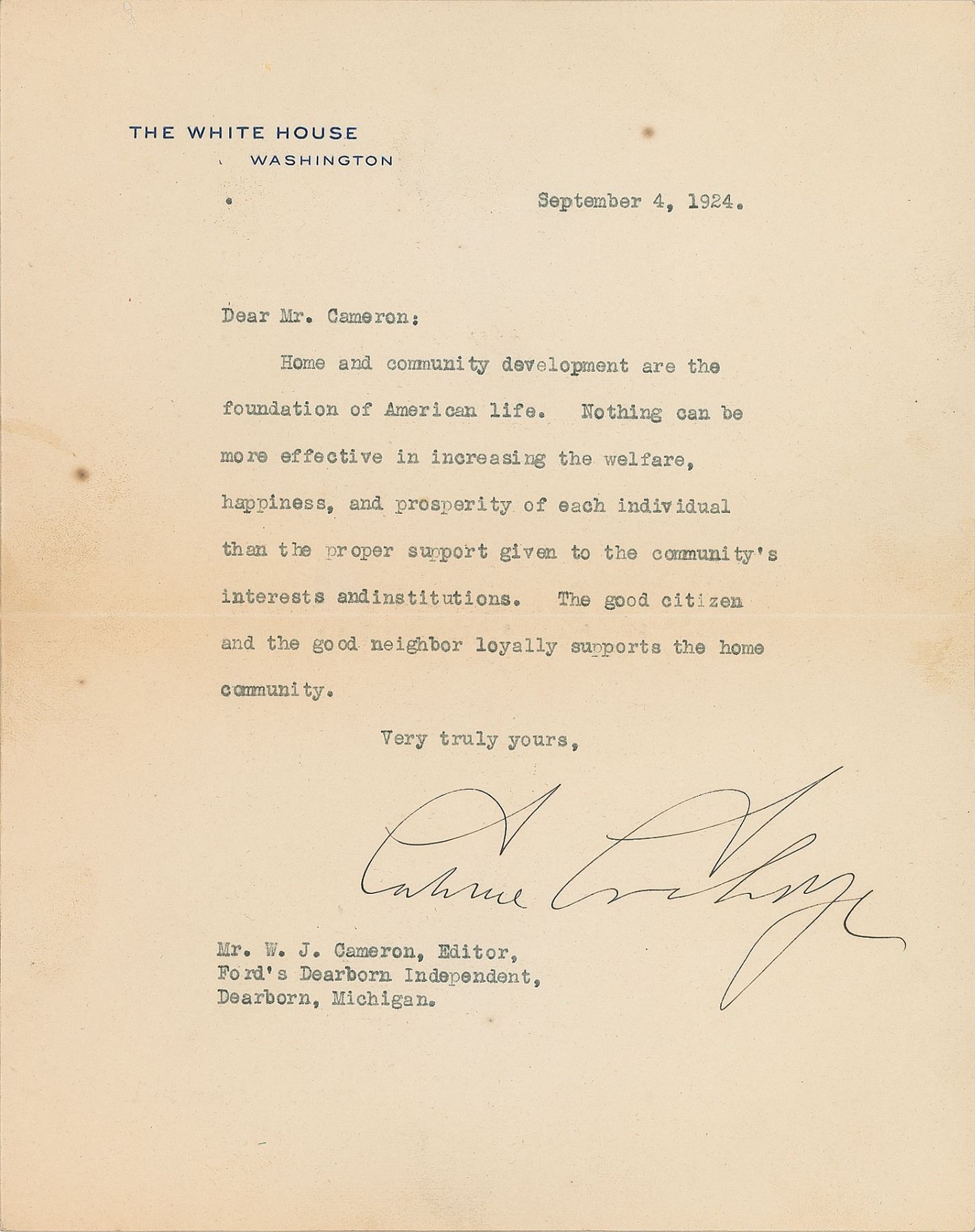 TLS as president, one page, 7 x 8.75, White House letterhead, September 4, 1924. Letter to W. J. Cameron, editor of Ford's Dearborn Independent, in part: "Home and community development are the foundation of American life. Nothing can be more effective in increasing the welfare, happiness, and prosperity of each individual than the proper support given to the community's interests and institutions. The good citizen and the good neighbor loyally supports the home community." In fine condition, with some light toning and a few small spots. Accompanied by the original mailing envelope. A fantastic, patriotic sentiment from a sitting president.