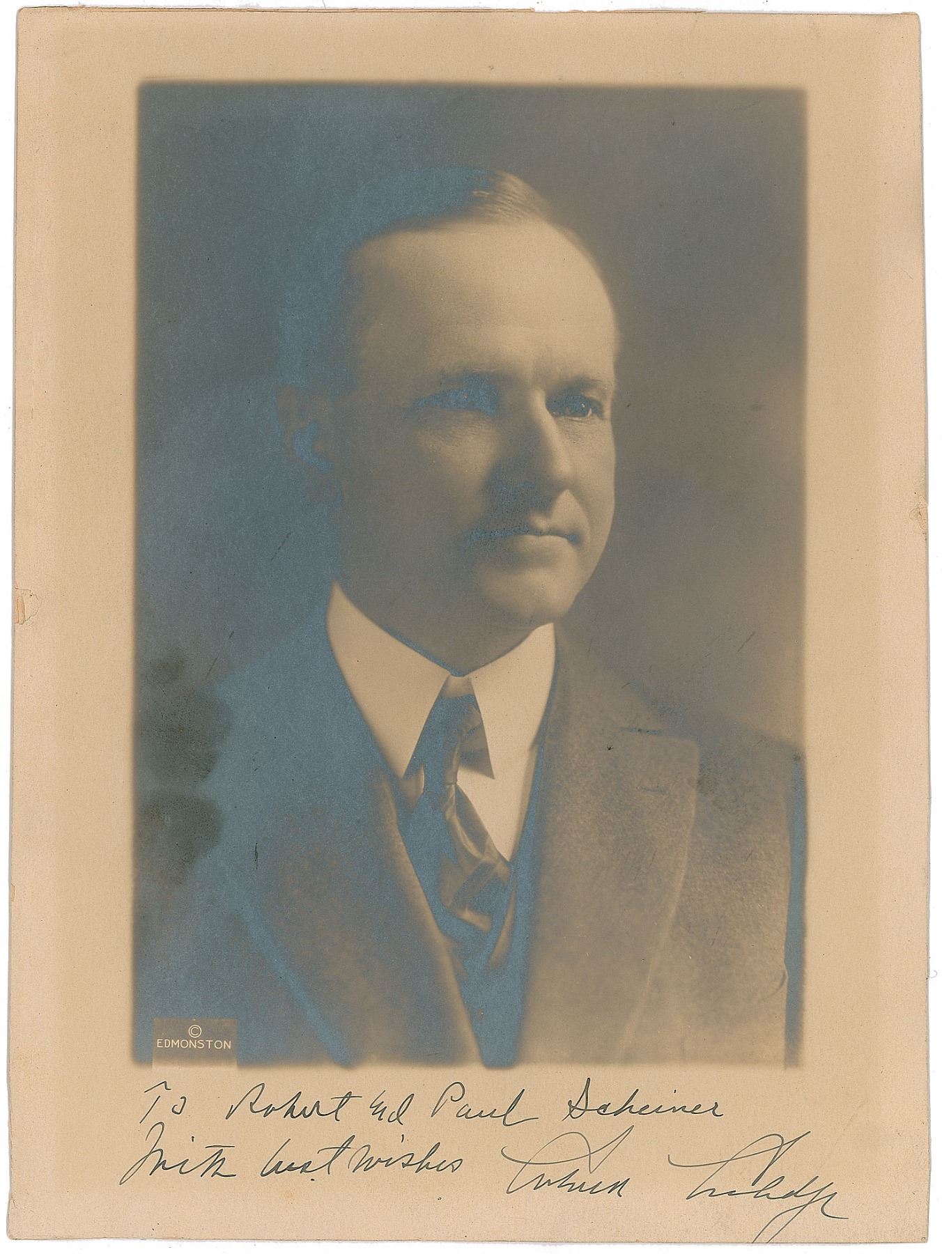 Vintage matte-finish 6 x 8 bust-length portrait of Coolidge by the Edmonston Studio of Washington, D.C., signed and inscribed in the lower border in fountain pen, "To Robert and Paul Scheiner, with best wishes, Calvin Coolidge.” In very good condition, with trimmed edges, heavy silvering, and two fingerprint impressions to Coolidge's right shoulder.