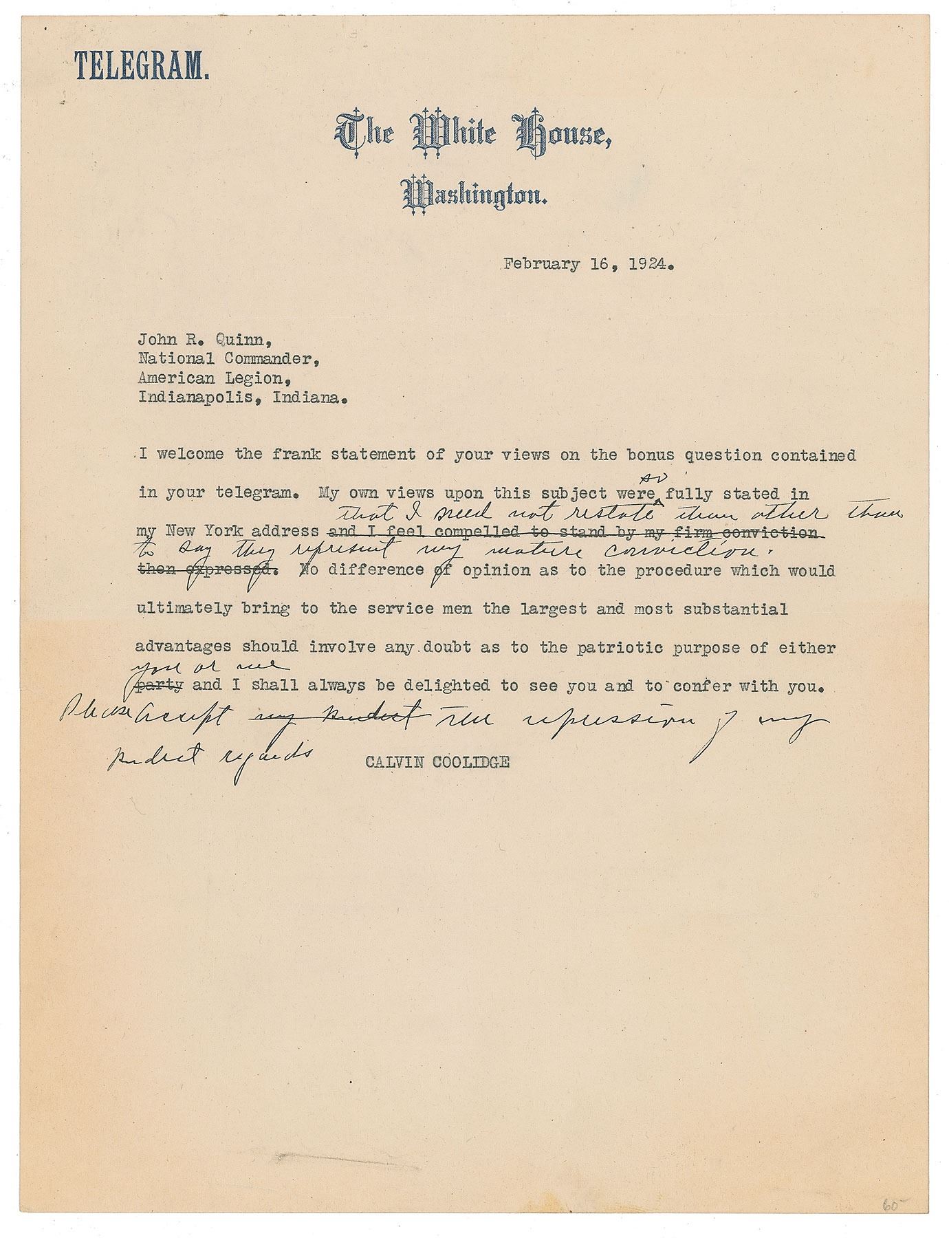 Hand-corrected typed telegram draft as president, one page, 7.75 x 10.5, White House Telegram letterhead, February 16, 1924. Typed draft of a telegram to John R. Quinn, national commander of the American Legion, with copious handwritten corrections by President Coolidge. In part (Coolidge's handwritten changes in italics): "I welcome the frank statement of your views on the bonus question contained in your telegram. My own views upon this subject were so fully stated in my New York address that I need not restate them other than to say they represent my mature conviction. No difference of opinion as to the procedure which would ultimately bring to the service men the largest and most substantial advantages should involve any doubt as to the patriotic purpose of either you or me and I shall always be delighted to see you and to confer with you. Please accept the expression of my kindest regards." In fine condition.