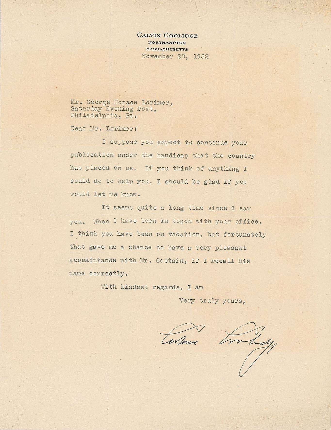 TLS, one page, 8.5 x 11, personal letterhead, November 28, 1932. Letter to George Horace Lorimer, the editor of The Saturday Evening Post, in full: "I suppose you expect to continue your publication under the handicap that the country has placed on us. If you think of anything I could do to help you, I should be glad if you would let me know. It seems quite a long time since I saw you. When I have been in touch with your office, I think you have been on vacation, but fortunately that gave me a chance to have a very pleasant acquaintance with Mr. Costain, if I recall his name correctly." In fine condition.
