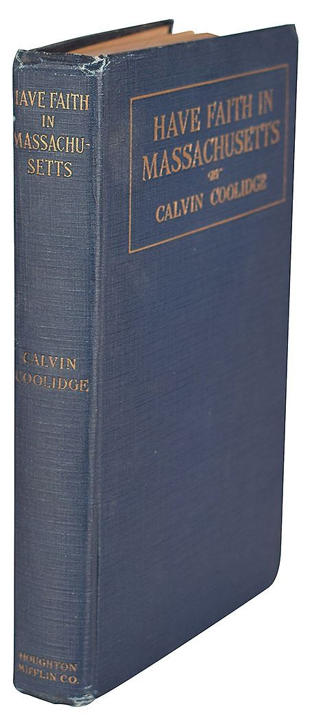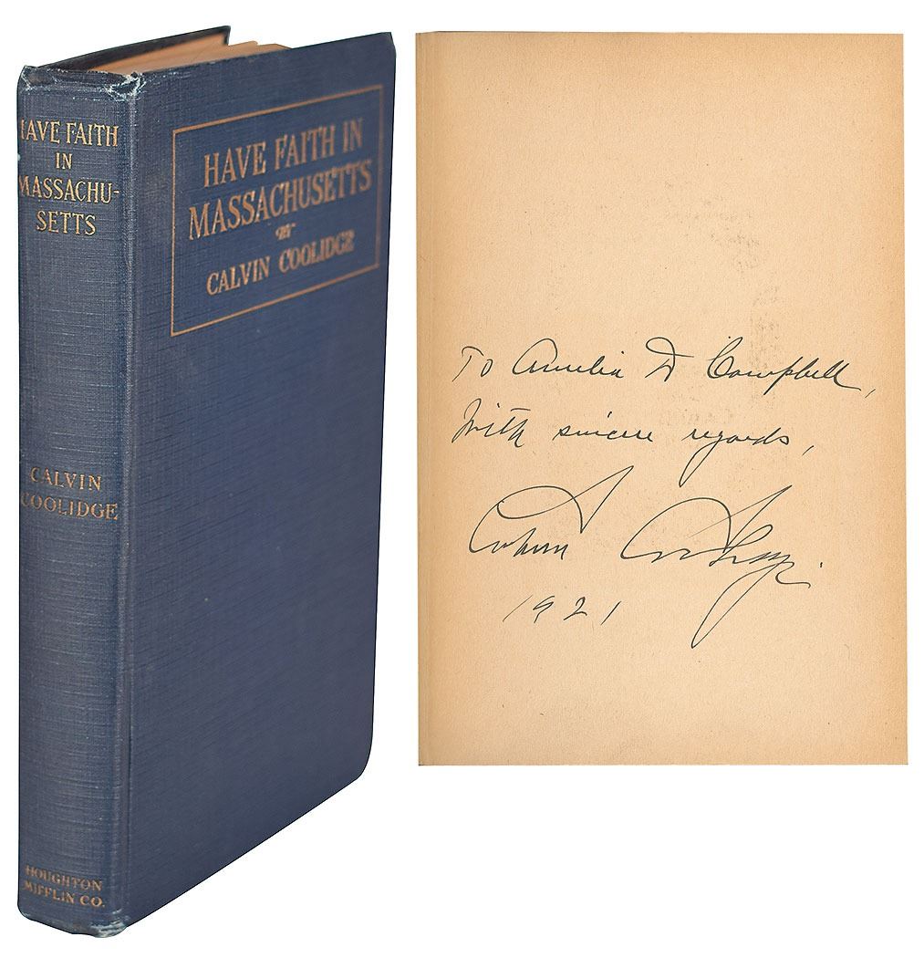 Signed book: Have Faith in Massachusetts. Second edition enlarged. Boston: Houghton Mifflin, 1919. Hardcover bound in navy blue cloth with gilt lettering, 5.5 x 7.75, 275 pages. Signed and inscribed on the first free end page in fountain pen, "To Amelia D. Campbell, With sincere regards, Calvin Coolidge, 1921." Autographic condition: fine, with a light paperclip impression to the top of the signed page. Book condition: VG/None, with an "Amelia Day Campbell Parker" and a "Library of Lawrence E. Miller" blindstamp to the final page.