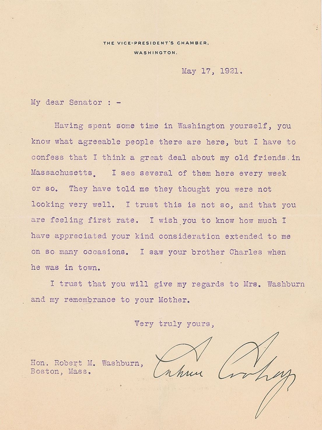 TLS, one page, 6.75 x 9, The Vice-President's Chamber letterhead, May 17, 1921. Letter to Robert M. Washburn, a former senator from Massachusetts, in full: "Having spent some time in Washington yourself, you know what agreeable people there are here, but I have to confess that I think a great deal about my old friends in Massachusetts. I see several of them here every week or so. They have told me they thought you were not looking very well. I trust this is not so, and that you are feeling first rate. I wish you to know how much I have appreciated your kind consideration extended to me on so many occasions. I saw your brother Charles when he was in town. I trust that you will give my regards to Mrs. Washburn and my remembrance to your Mother." In fine condition. Washburn's subpar health seemed to be a recurring issue; he resigned early into his only term in the Senate due to ill health in 1916.