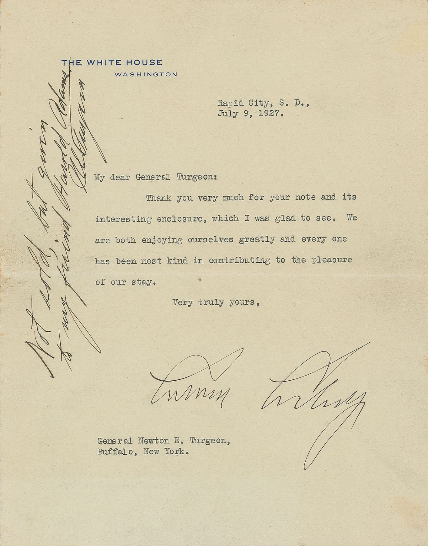 TLS as president, one page, 7 x 8.75, White House letterhead, July 9, 1927. Letter to General Newton E. Turgeon, in full: "Thank you very much for your note and its interesting enclosure, which I was glad to see. We are both enjoying ourselves greatly and every one has been most kind in contributing to the pleasure of our stay." In the left margin, Turgeon writes: "Not sold, but given to my friend Harold Adams, N. E. Turgeon." In fine condition, with some light creasing.