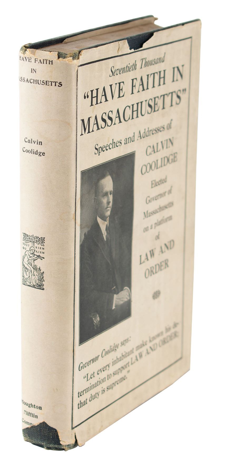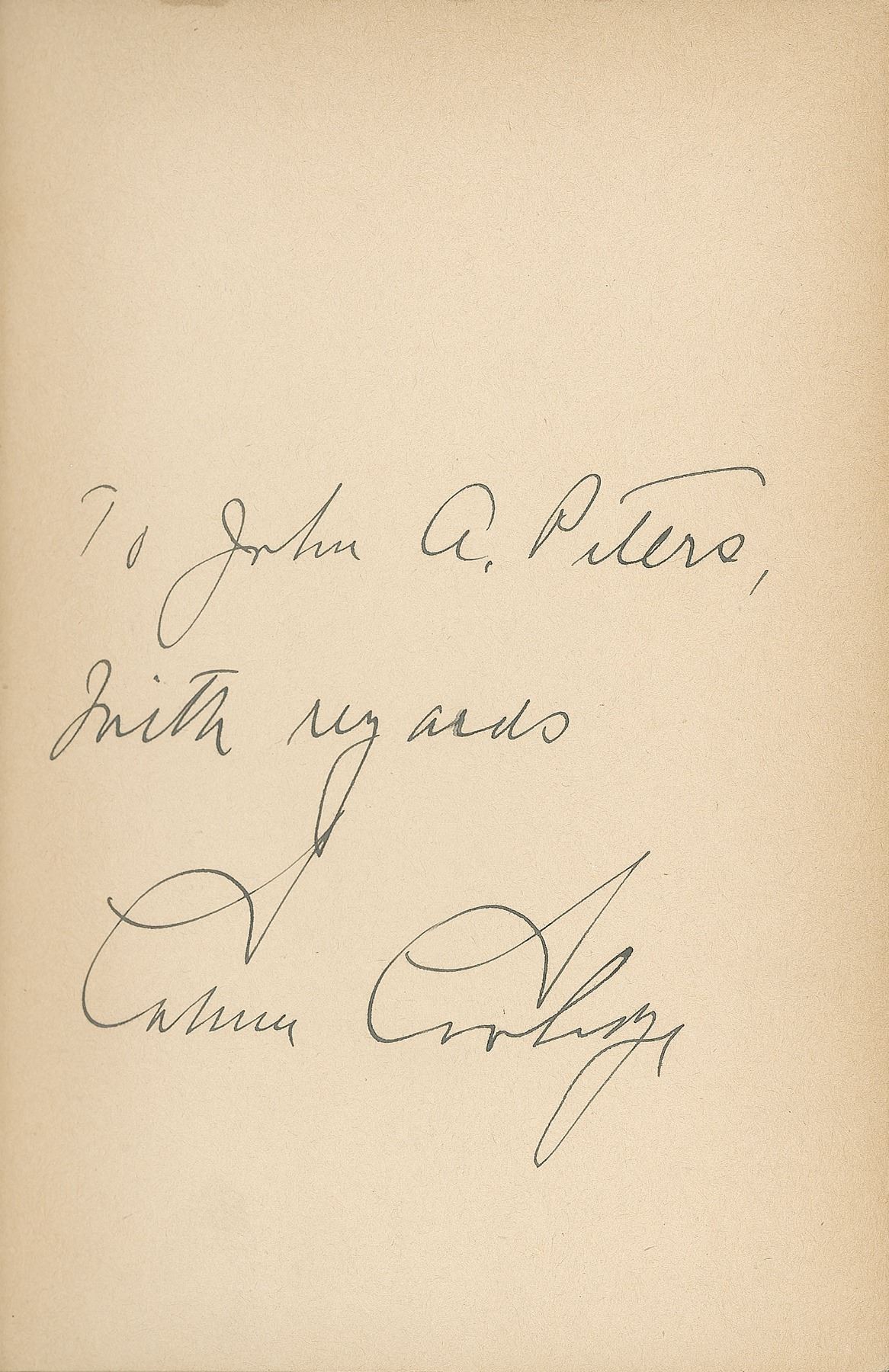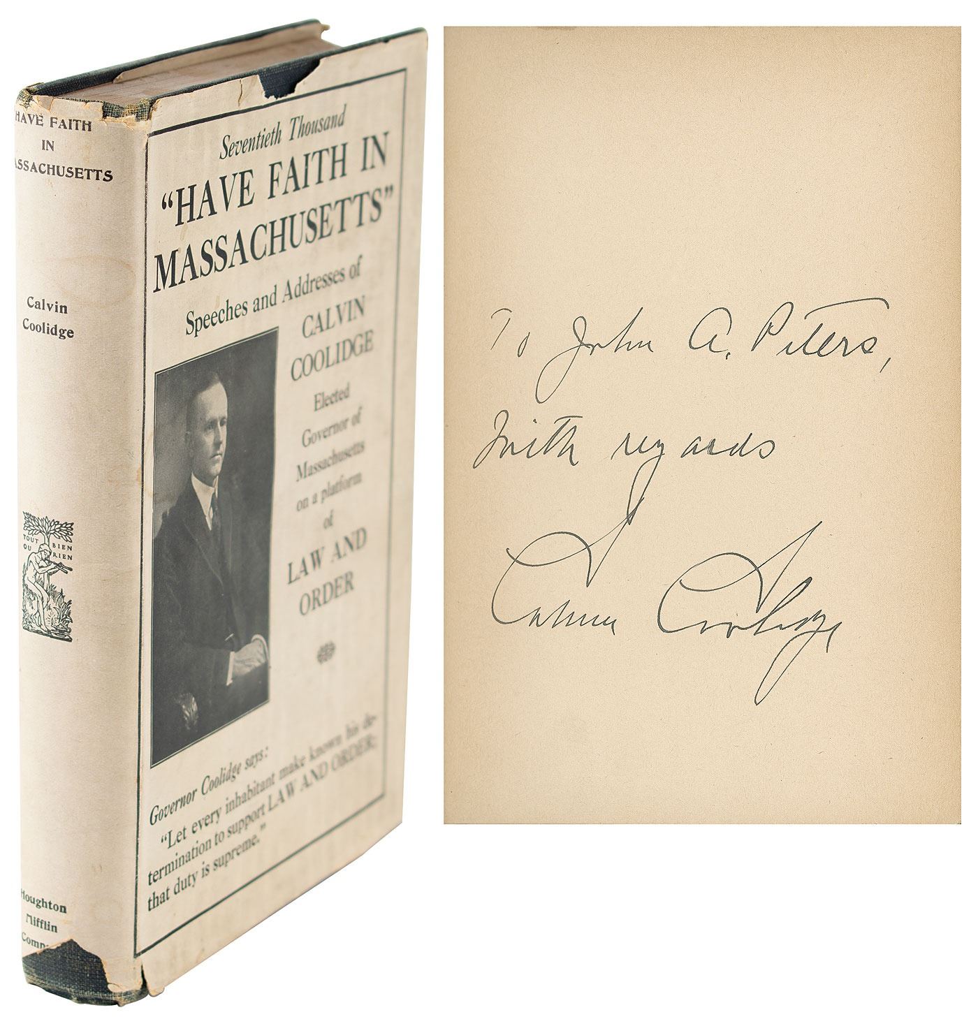 Signed book: Have Faith in Massachusetts. Second edition enlarged. Boston: Houghton Mifflin, 1919. Hardcover with dust jacket, 5.5 x 7.75, 275 pages. Signed and inscribed on the first free end page in fountain pen, "To John A. Peters, With regards, Calvin Coolidge." In very good to fine condition, with uniform toning to the signed page, and soiling and chipping to the dust jacket.