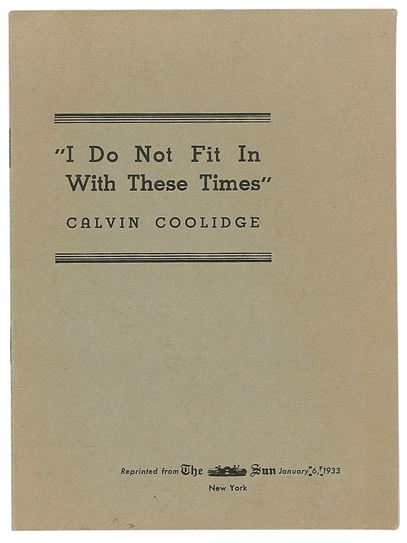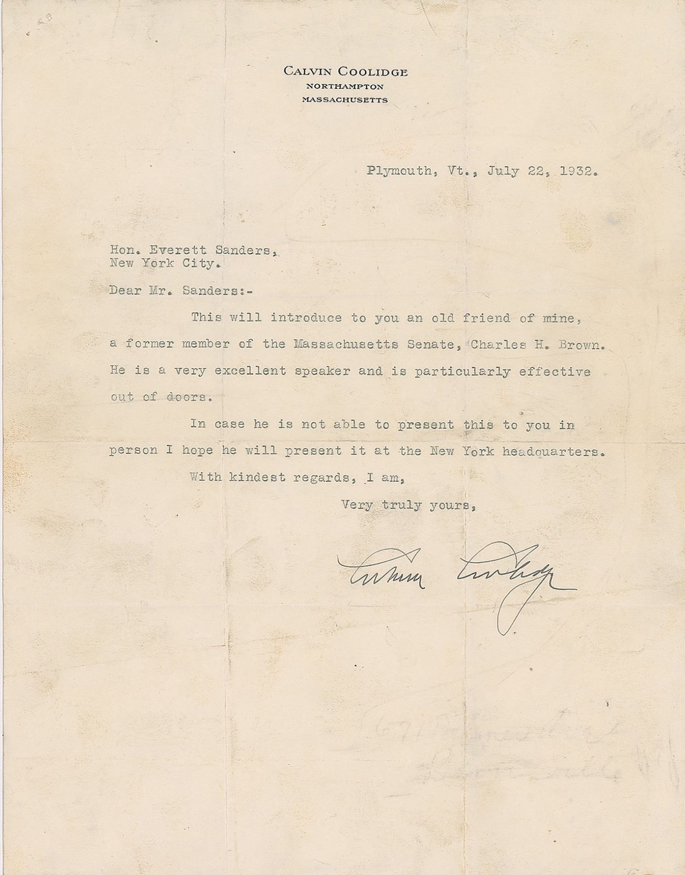 TLS, one page, 8.5 x 11, personal letterhead, July 22, 1932. Letter to Everett Sanders, who had been his presidential secretary and was then serving as chairman of the Republican National Committee. In full: "This will introduce to you an old friend of mine, a former member of the Massachusetts Senate, Charles H. Brown. He is a very excellent speaker and is particularly effective out of doors. In case he is not able to present this to you in person I hope he will present it at the New York headquarters." In very good condition, with intersecting folds, overall creasing, and staple holes to the upper left corner. Accompanied by an unsigned booklet entitled "I Do Not Fit In With These Times," published in 1933.