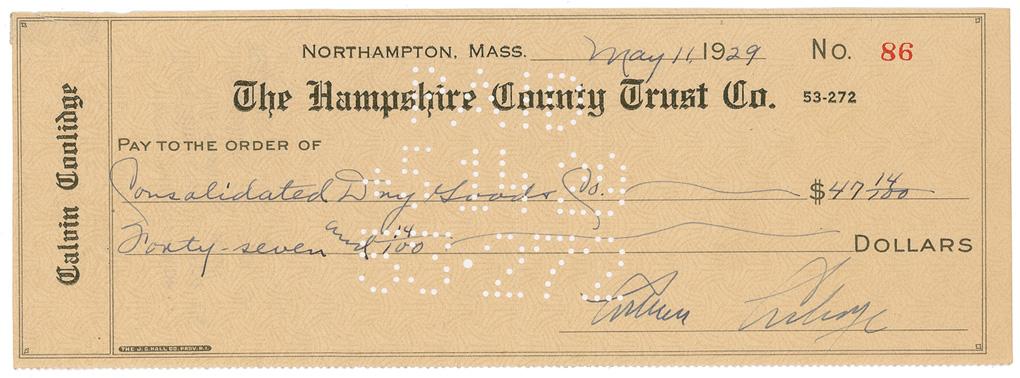 Personal check, 8.25 x 3, filled out in another hand and signed by Coolidge, payable to Consolidated Dry Goods Co. for $47.14, May 11, 1929. In fine condition, with two vertical folds (one through a single letter of signature), a light shade of toning, and expected cancellation holes.
