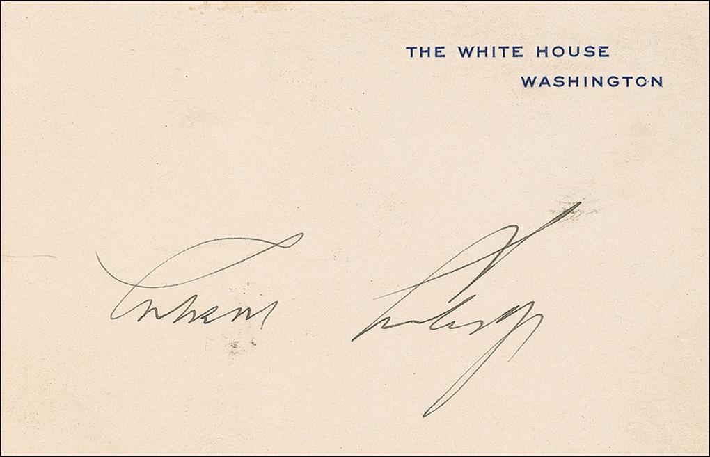 White House card, signed in black ink, “Calvin Coolidge.” In fine condition, with a mild shade of toning, and trivial adhesive remnant to top edge.
