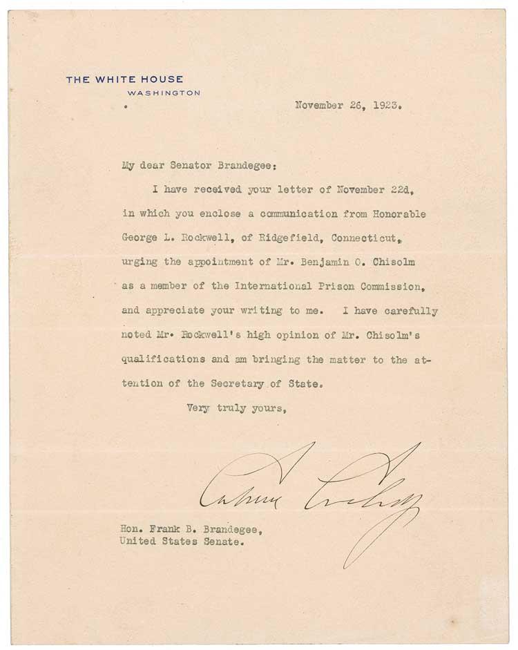 TLS as president, one page, 7 x 9, White House letterhead, November 26, 1923. Letter to Senator Frank Brandegee regarding a political appointment. In part: “I have received your letter…urging the appointment of Mr. Benjamin C. Chisolm as a member of the International Prison Commission…I have carefully noted Mr. Rockwell’s high opinion of Mr. Chisolm’s qualifications and am bringing the matter to the attention of the Secretary of State.” A mild overall shade of toning, and a horizontal fold above and below signature, otherwise fine condition. Pre-certified John Reznikoff/PSA/DNA and RRAuction COA.