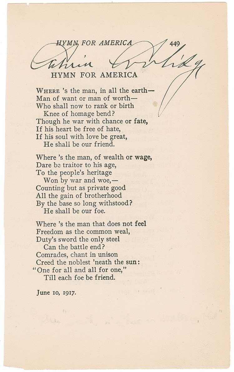 Printed poem entitled “Hymn for America,” 4.25 x 6.75, removed from a larger book, boldly signed at the top in black ink by Coolidge. Poem begins, “Where's the man, in all the earth—Man of want or man of worth—Who shall now to rank or birth, Knee of homage bend?” In fine condition, with a mild shade of toning, and light pencil remnants along bottom edge, easily matted out. Pre-certified John Reznikoff/PSA/DNA and RRAuction COA.
